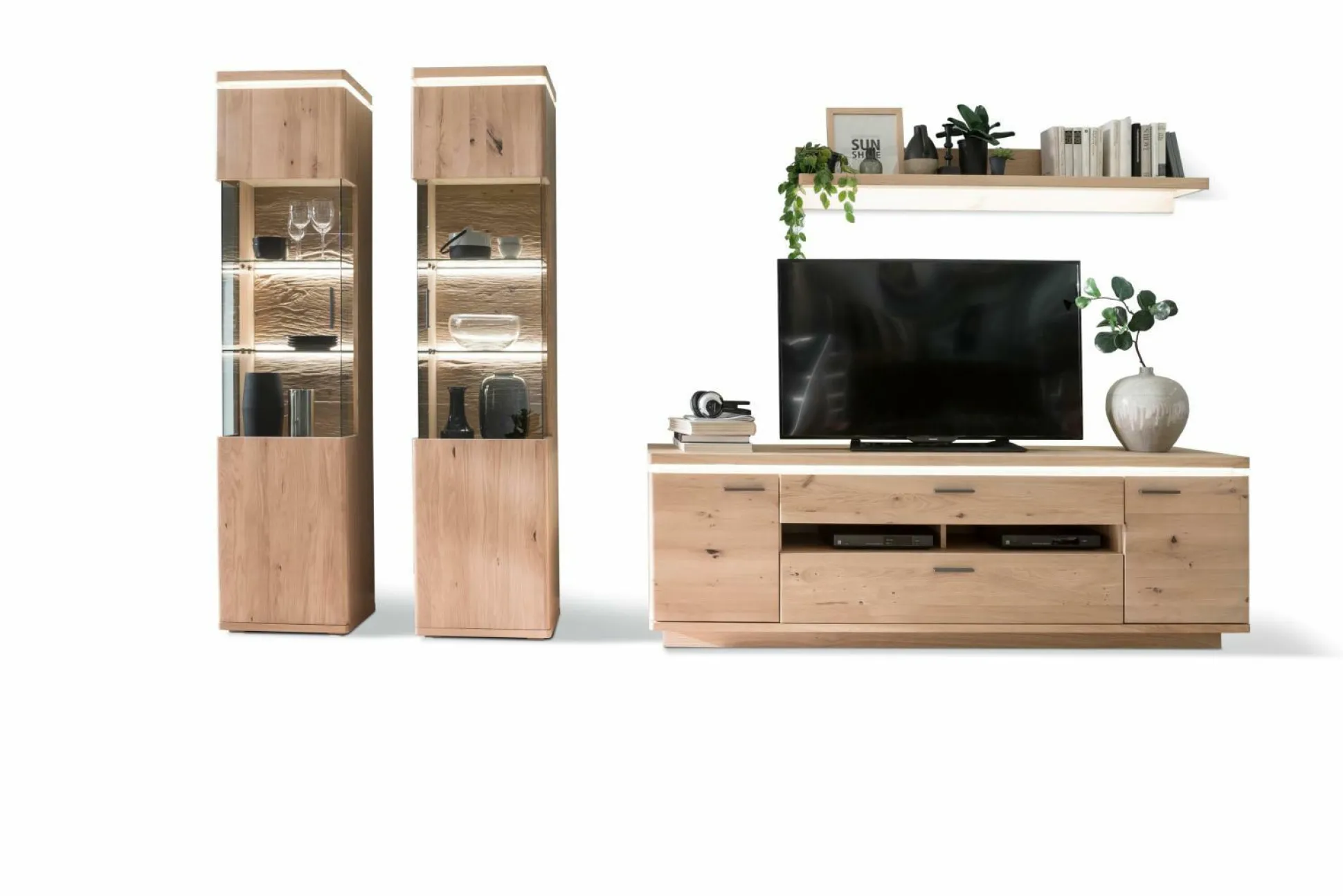 Barcelona, Front: Balkeneiche Bianco massiv durchgehende Lamelle, Oberfläche geölt, Korpus: Eiche bianco furniert, Oberfläche geölt, Rückwand sichtbar: 3D Balkeneiche Nachbildung, geschroppt, Rückwand hinter Türen und Schubkästen Balkeneiche Nachb., Front/Seitenverglasung Parsol grau, Glasböden: Klarglas, Griff: Metall schwarzgrau, Türen und Schubkästen gedämpft, bestehend aus: Vitrine li. u. re., Lowboard, Wandboard, Beleuchtung Oberboden inklusive, weitere Beleuchtung auf Wunsch, für Fernsehergrößen bis 80 Zoll, Maße = ca. Montage-/Stellmaße