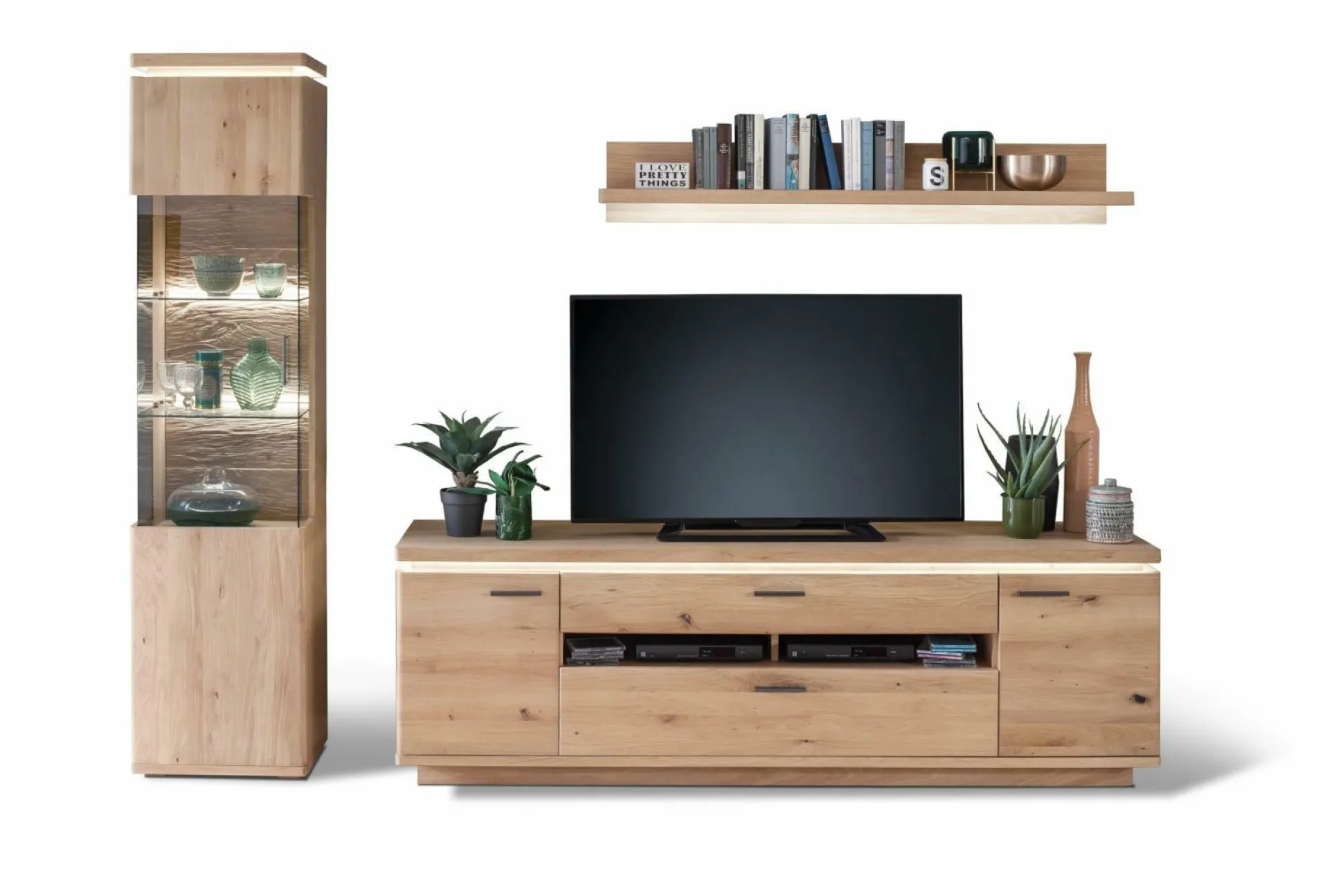 Wohnwand Madrid aus dem Hause Harper begeistert mit ihrem natürlichen Design. Die Elemente sind mit einem Korpus aus Eiche bianco versehen und werden zum Teil von Fronten in massiver Balkeneiche ergänzt. Zu der Wohnwand gehören ein Lowboard, ein Wandboard und eine Vitrine. Damit erhalten Sie ausreichend Stauraummöglichkeiten für technische Geräte, Geschirr, Deko und Zubehör. Der natürliche Look macht die Wohnwand zu einem echten Highlight, wobei der Oberboden beleuchtet wird und Ihre Lieblingsstücke besonders schön in Szene setzt. Das Lowboard ist für eine Fernsehergröße bis zu 80 Zoll ausgerichtet. Weitere Beleuchtung können Sie auf Wunsch hin zu bestellen.