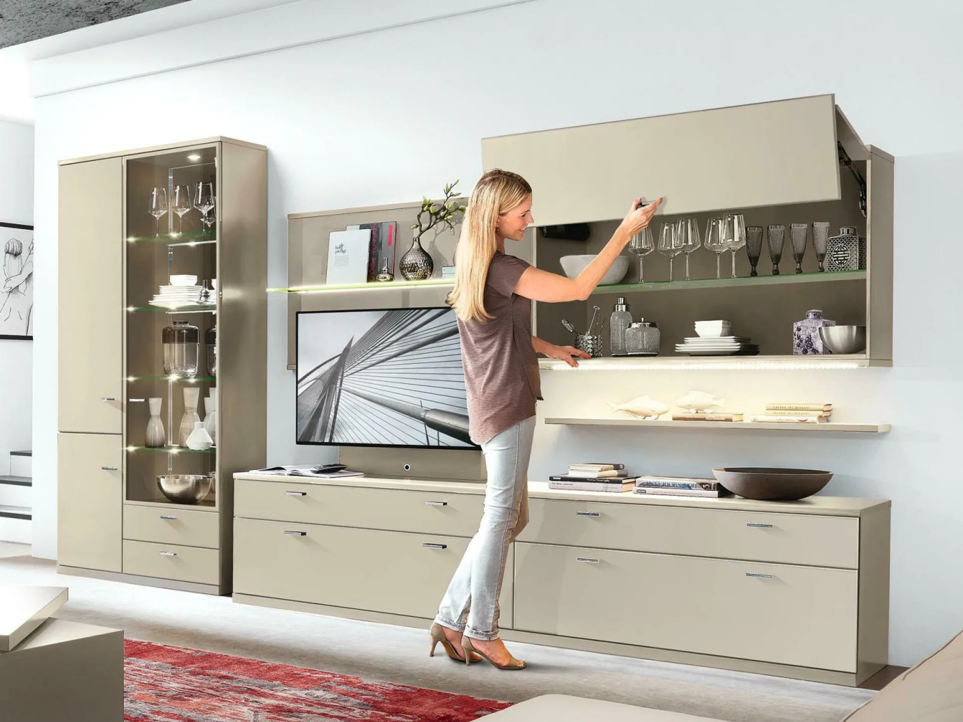 Wohnwand Alicante von MONDO besticht mit einem hochwertigen und exklusiven Design. Die schicke Anbauwand zeichnet sich durch eine helle Mattlackfront aus und wird von hochwertigem Holz abgerundet. Schlichte Griffe runden den exquisiten Look ab, der zu einem absoluten Hingucker in Ihrem Wohnbereich wird. Die einzelnen Elemente bieten ausreichend Stauraum für Geschirr, Gläser, Dekorationsobjekte und vieles mehr.Zu der Wohnwand zählen folgende Typen: