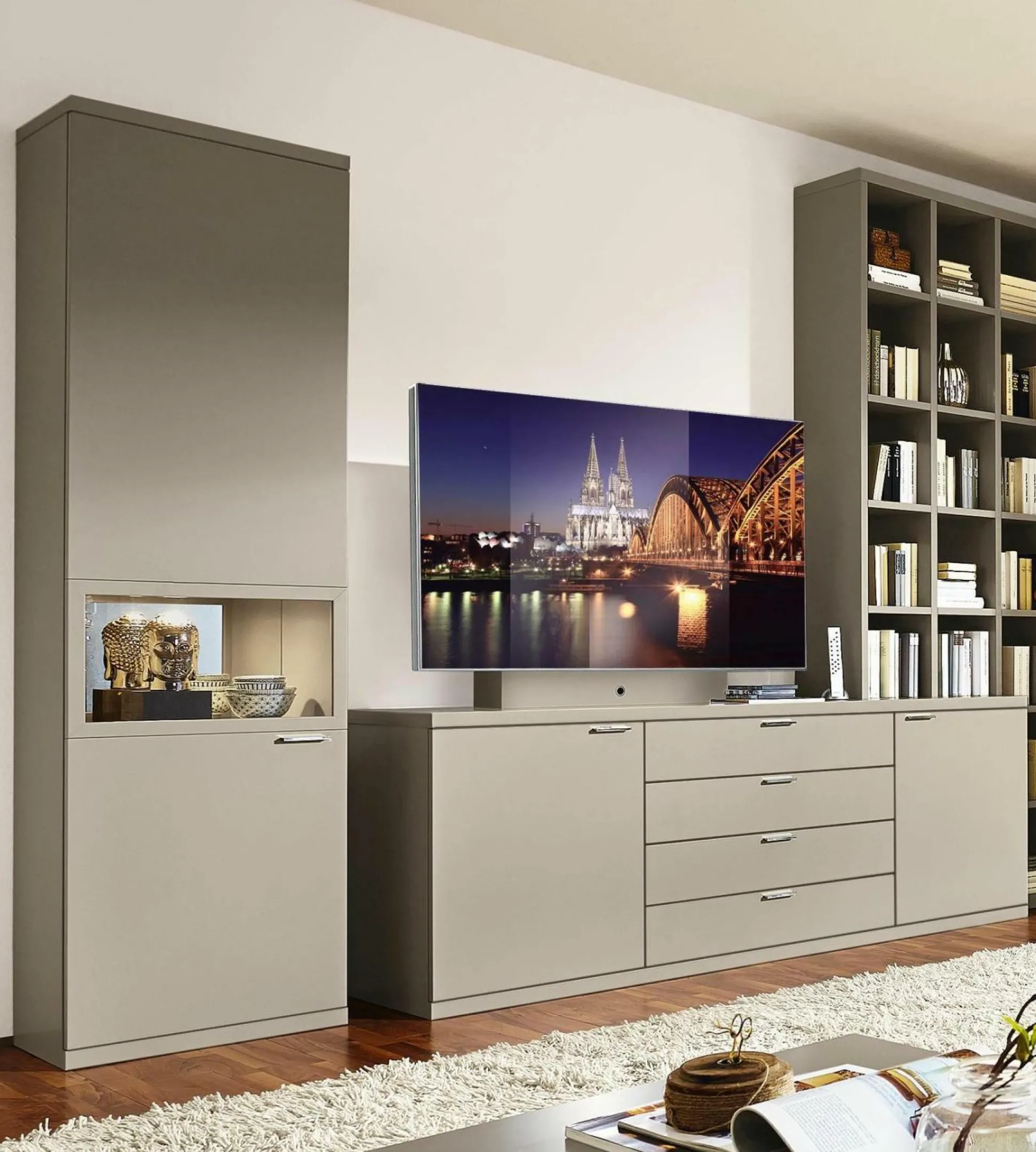 Bereichern Sie Ihren Wohnraum mit der Wohnwand Artist aus dem Hause Mondo. Diese stilvolle Wohnwand erscheint in Lack platingrau und lässt sich somit gut in verschiedene Einrichtungsstile integrieren. Die großzügige Gestaltung mit vielen Türen und Schubkästen bietet außerdem eine gute Mischung zwischen Stauraum und Dekorationsmöglichkeiten.