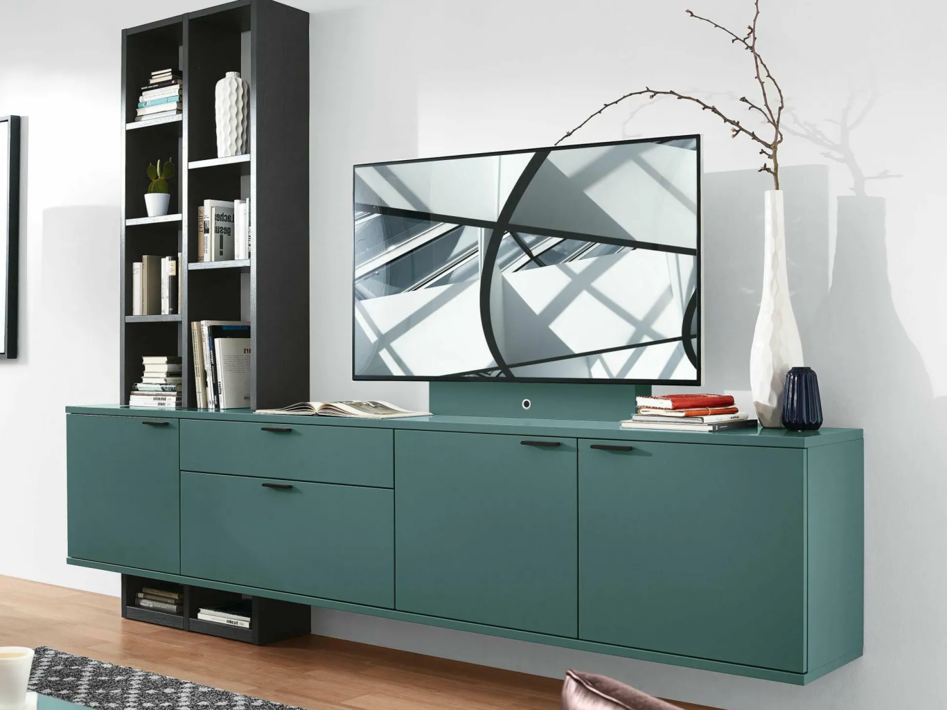 Front: Lack Ocean Korpus: Lack Ocean Stollen/Böden: Eiche Graphit furniert Griff J5 Lack Anthracite