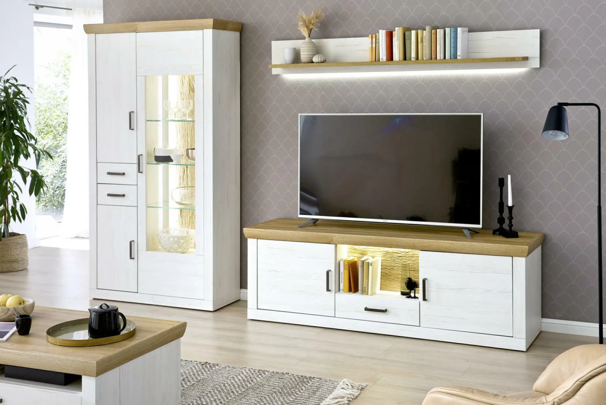 · 1x Vitrine links mit 2 Türen, 1 Tür mit Glas und 2 Schubkästen, BHT ca. 106 x 205 x 40 cm, 1x Lowboard rechts mit 2 Türen, 1 Schubkasten und 1 Fach, für Fernsehgröße bis 78 Zoll BHT ca. 181 x 62 x 50 cm, 1x Wandboard oben, BHT ca. 181 x 24 x 22 cm,