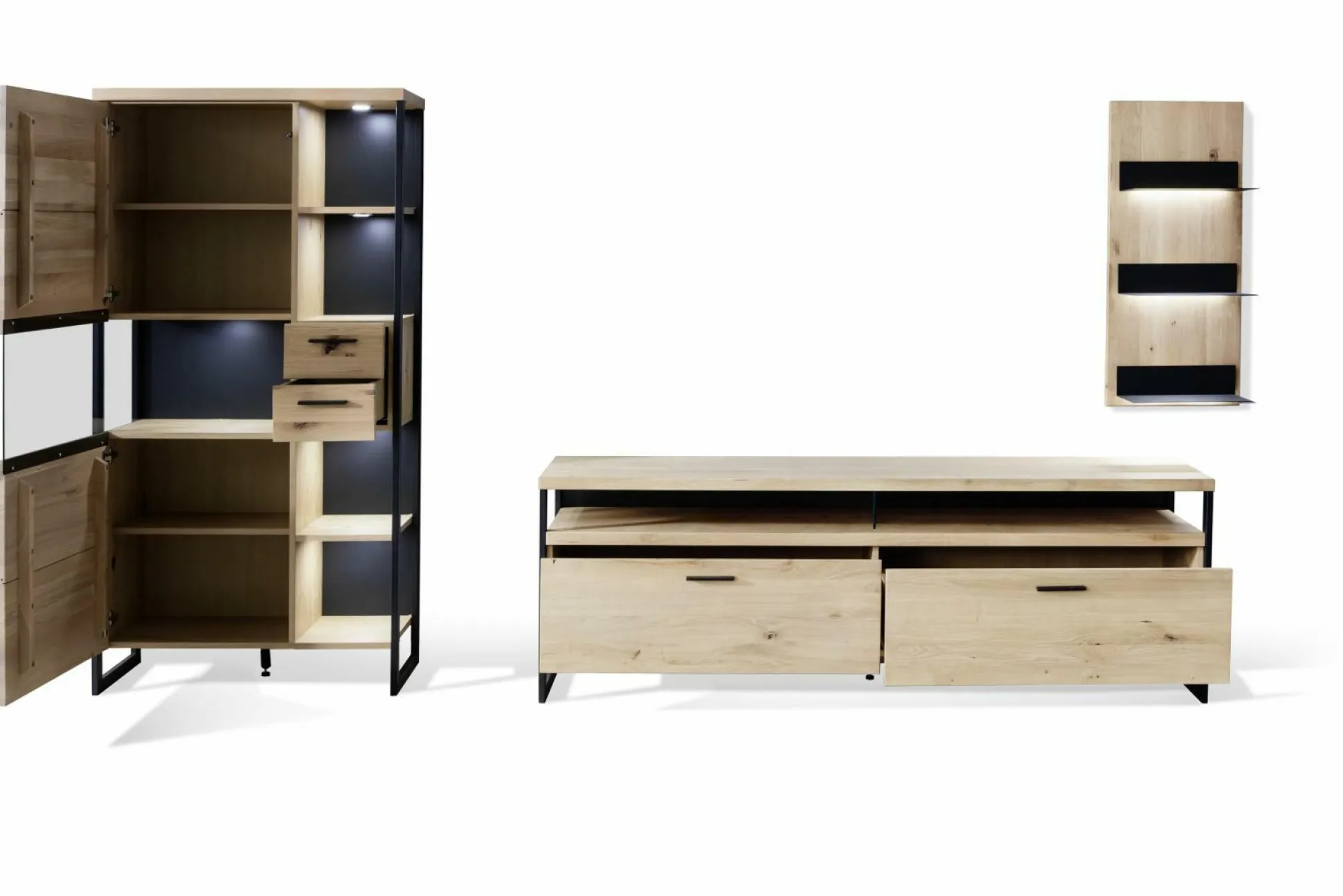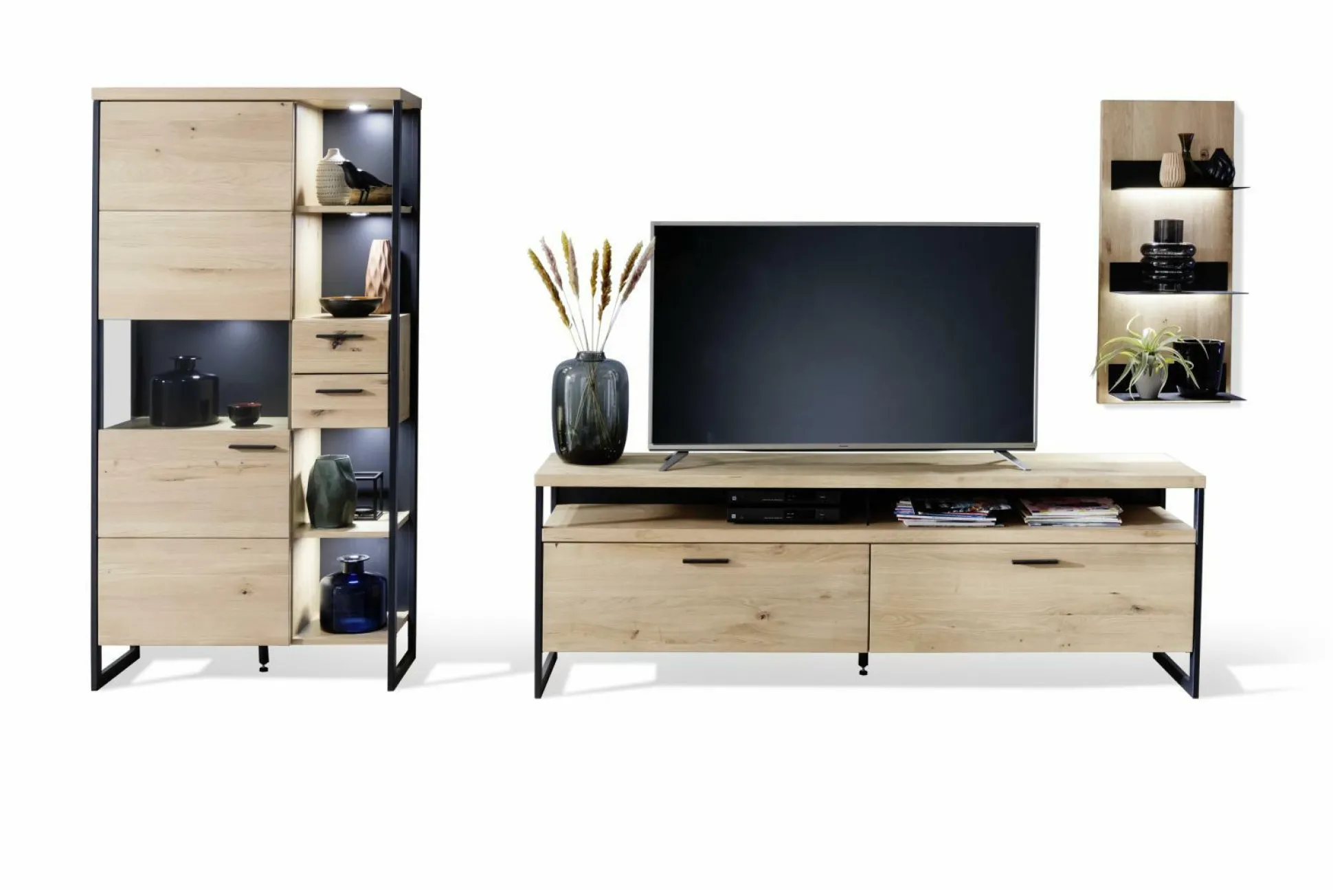 Mit der Wohnwand Lantana aus dem Hause vito ergänzen Sie Ihren Wohnbereich perfekt. Das moderne Design ist dabei ein absoluter Hingucker, der Familie und Freunde staunen lassen wird. Die Wohnwand besteht aus einer Vitrine, einem TV-Element und einem Wandboard. Der Korpus ist dabei aus furnierter Eiche bianco gefertigt und wird von einer Front aus massiver Balkeneiche ergänzt, die zusätzlich mit durchgehenden Lamellen versehen ist. Die Oberfläche ist dabei geölt. Die sichtbaren Rückwände sind anthrazitfarbig lackiert, während die Rückwände hinter Türen und Schubkästen aus Eiche Bianco Nachbildung sind. Metallrahmen und Metallböden in schwarzgrau, wobei Griffe aus Iron Black Metall runden das Gesamtdesign perfekt ab. Front- und Seitenverglasung sind aus grauem Parsolglas gefertigt. Türen und Schubkästen sind aus Unterflurführungen gedämpft. Auf Wunsch sind Beleuchtung und eine Funkfernbedienung erhältlich.