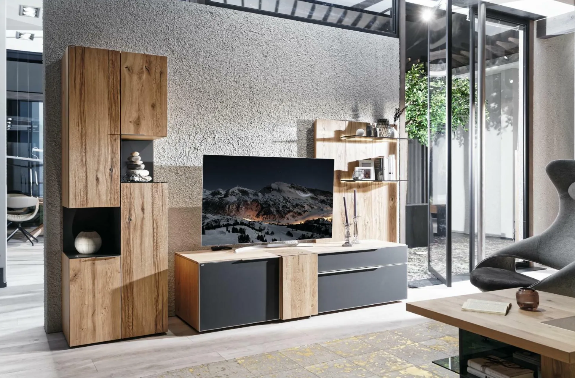 · Vitrinen und Glasböden: Parsolglas grau bestehend aus: 1x Lowboard mit 1 Schubladen, Kubus und 2 Klappen 1x Vitrine mit 4 Türen und 2 offen Fächern vorstehend links 1x Wandpaneel mit 2 Glasborden vorstehend rechts
