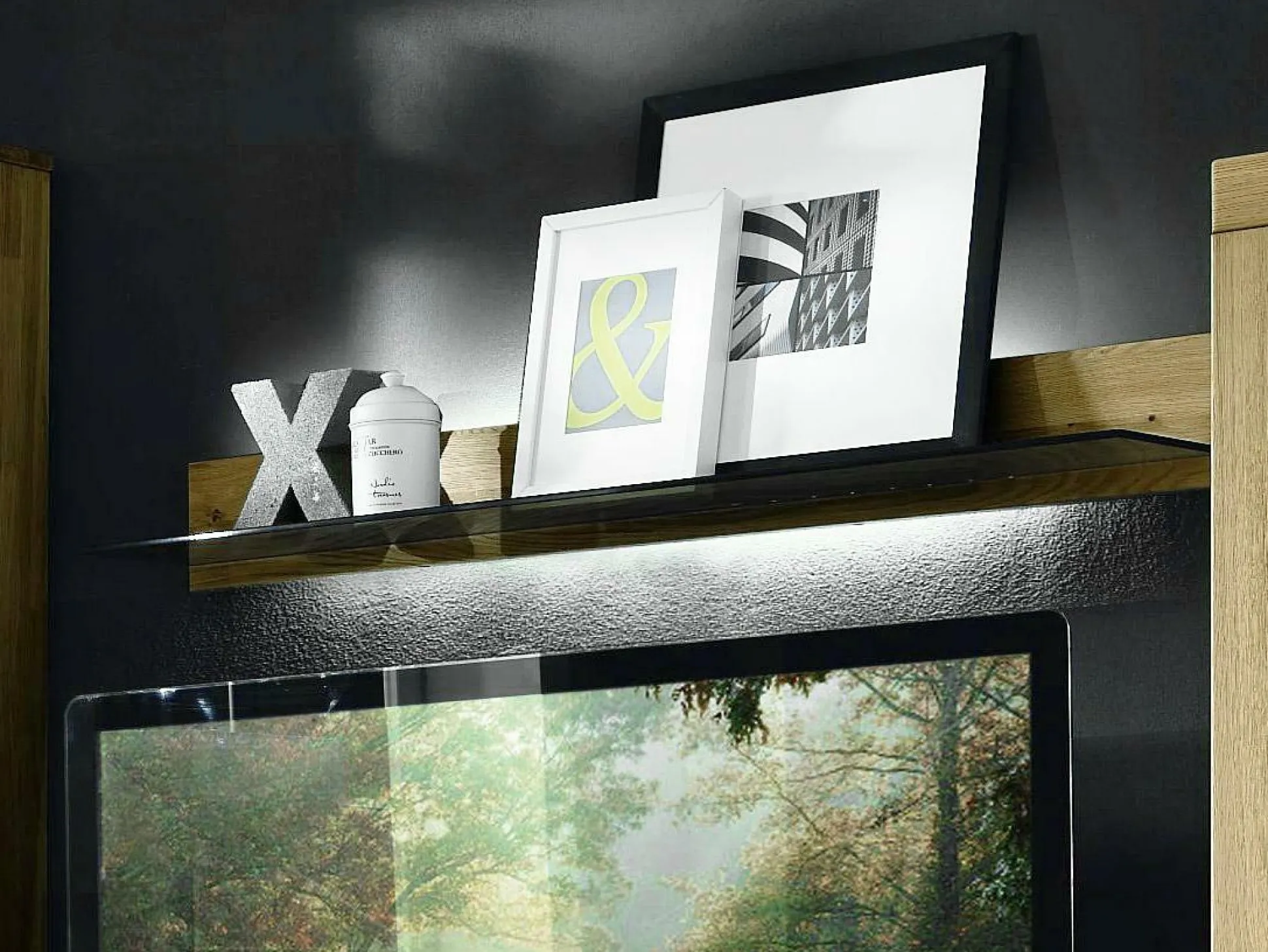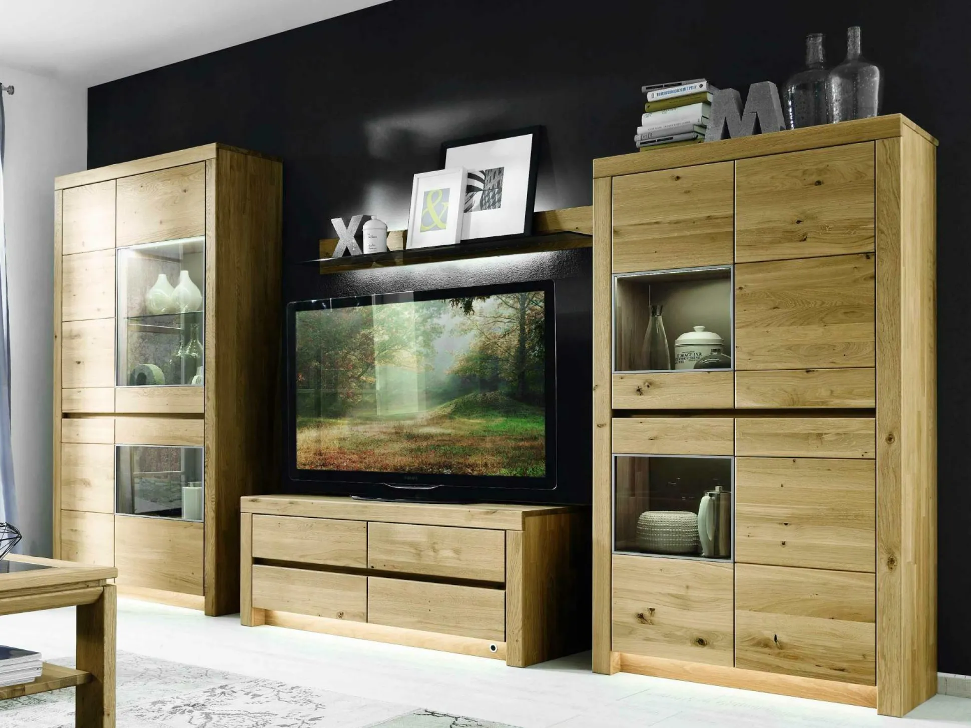 Schaffen Sie sich ein warmes und gemütliches Ambiente in Ihren Wohnräumen mit der Wohnwand Soraga von witlake. Die edle Wohnkombination ist aus massiver, soft gebürsteter, europäischer Wildeiche gefertigt, deren natürlicher Look durch die Metall- und Glaselemente einen modernen Charakter erhält. Soraga besteht aus einer Vitrine (BHT 112,3/200,8/42,1) mit zwei Holztüren links und zwei Holz-/Glastüren rechts, einem Medienelemente (BHT 131,2/52,2/51,7), ausgestattet mit drei Schubkästen und einer Medienklappe unten rechts, einem Wandboard (BHT 131,2/14,9/23,2) mit Glasboden und einer Vitrine (BHT 93,4/168,8/42,1) mit zwei Holztüren rechts und oben mit zwei Holz-/ Glastüren links. Die moderne Optik gibt Wohnbereichen ein neues Gesicht.
