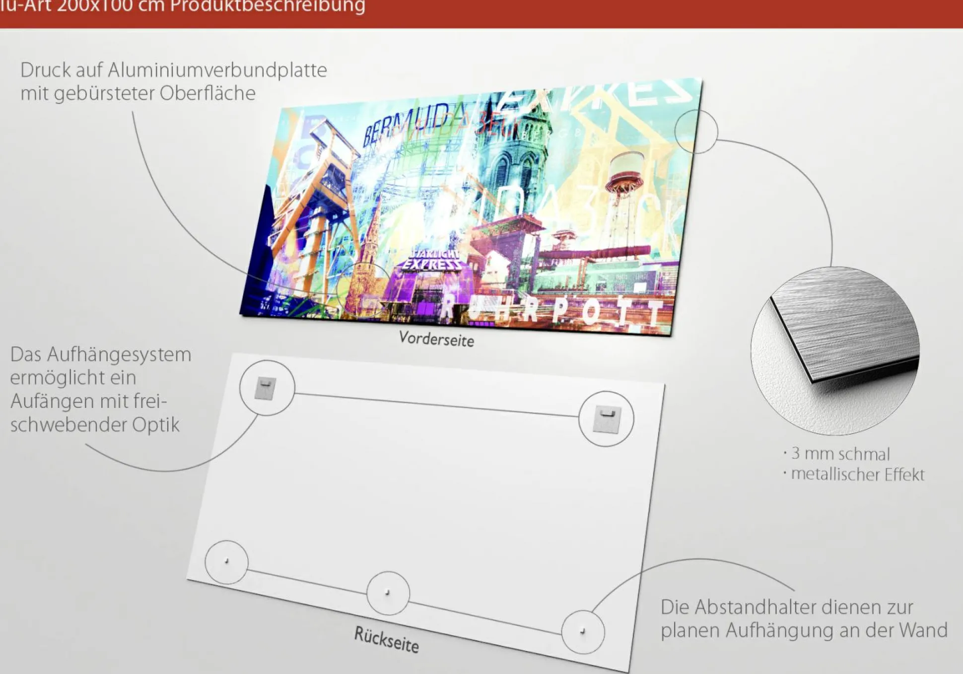Dekorieren Sie Ihren Wohnraum mit diesem Stück Heimat – dem Alu-Art Bochum von Pro-Art. Dieses schöne Kunstbild aus eine Aluanfertigung zeichnet sich durch eine besondere Farbgebung in verschiedensten Tönen aus. Auf dem Bild sind die bedeutendsten Wahrzeichen Bochums zu sehen, die für Heimatverbundene oder neue Bochumer eine besondere Atmosphäre in Ihrem Zuhause erzeugt.