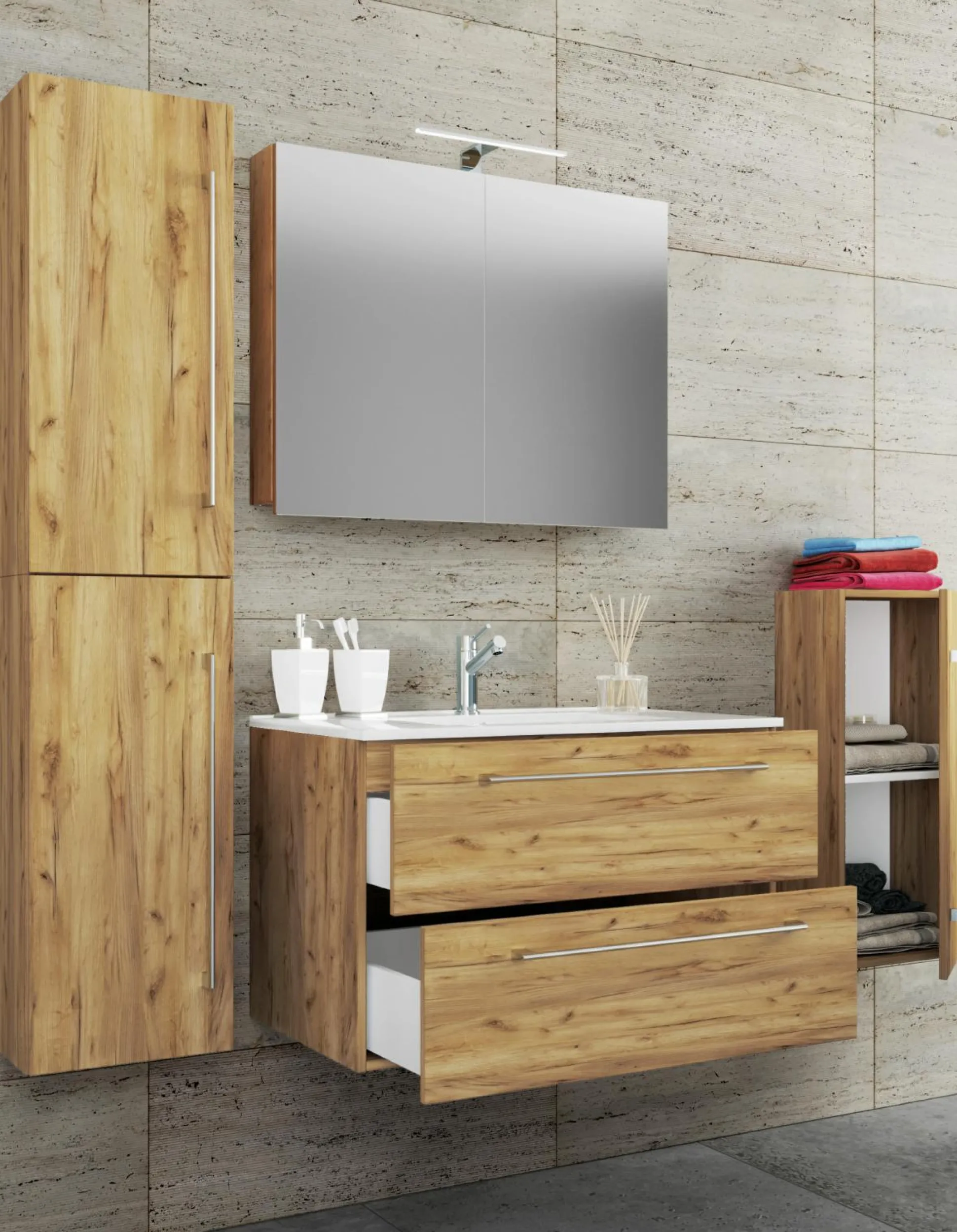 · Ein modernes Waschbecken aus massivem Keramik und einem Spiegelschrank aus ESG-Sicherheitsglas runden das Möbel ab, um den perfekten Bickfang im Badezimmer zu erhalten.