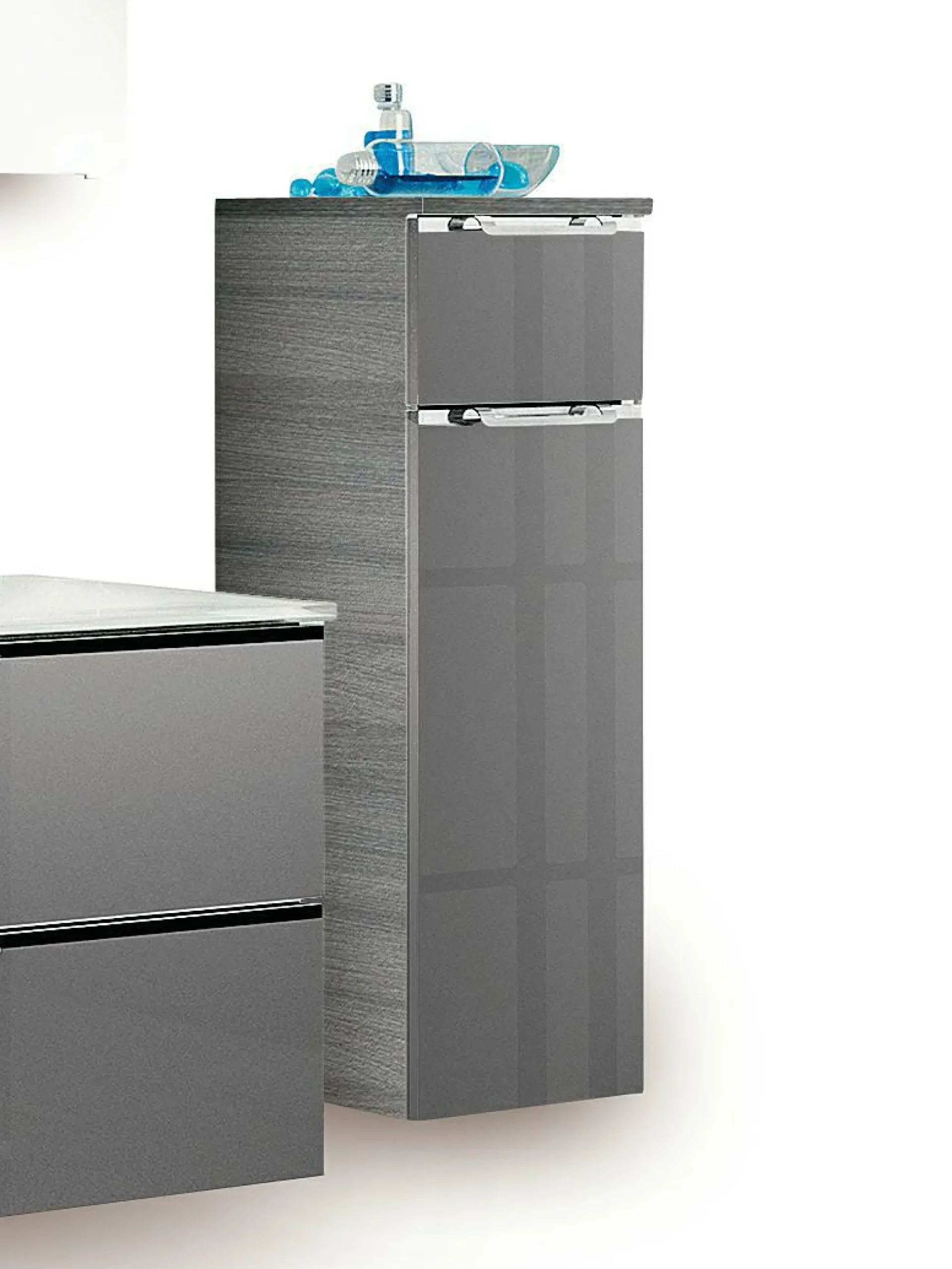 Das Highboard Trentino von pelipal ist ein geschmackvolles Element für Ihren Badebereich. Der Schrank überzeugt mit einem grauen Glasfront und einem queren Struktur-Nachbildung- Graphitkorpus und kann in die verschiedensten Stile integriert werden. Das schicke Highboard sorgt so für attraktive Akzente im Badezimmer. Hinter einer Tür und einem Schubkasten verbirgt sich ausreichend Stauraum für Ihre Badutensilien.