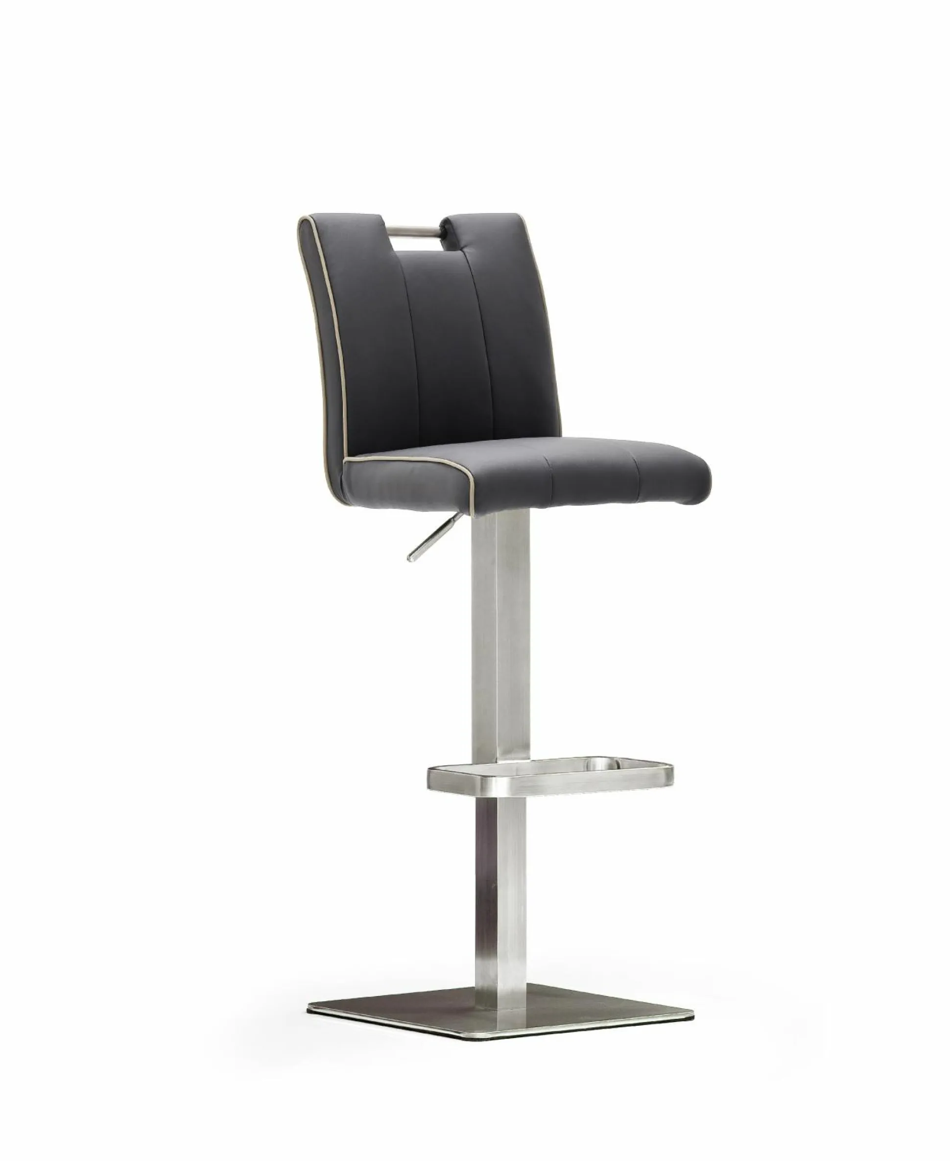 Bezug Kunstleder schwarz Gestell: Edelstahl gebürstet, Standteller: ca. 40 x 40 cm Edelstahl gebürstet ummantelt, max. Belastbarkeit bis 120 kg Gasdruckfeder 25 cm Sitzhöhe einstellbar von 55 – 80 cm, 180° drehbar mit Nivellierung Sitzbreite ca. 38cm, Sitztiefe ca. 38cm