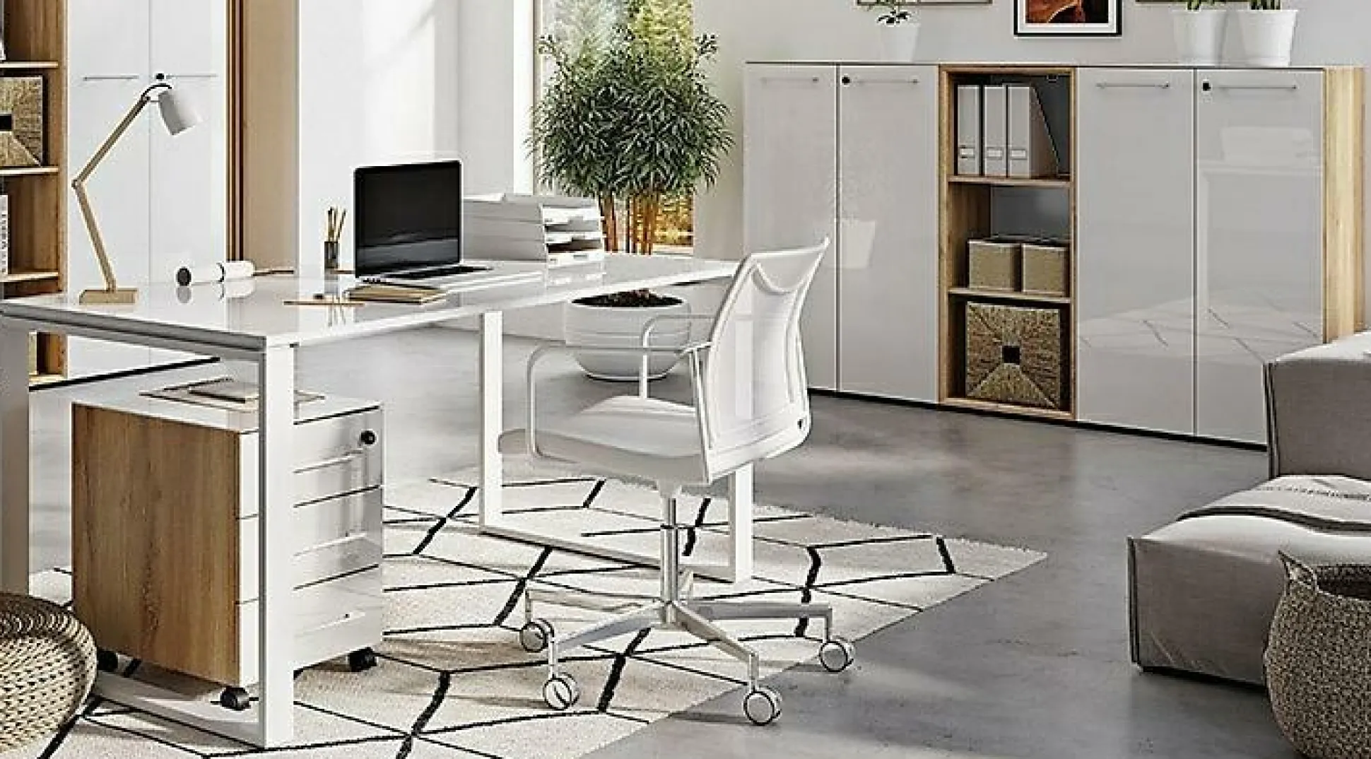 · Set bestehend aus einem Schreibtisch, einem Rollcontainer, zwei Aktenschränken und einem Aktenregal, Schreibtisch mit zwei pulverbeschichteten Metallkufen, Tischplatte belastbar bis zu 30 kg, Rollcontainer mit drei Schubkästen inkl. Selbsteinzug, ein Schubkasten abschließbar, vier Laufrollen – zwei davon mit Feststellbremse, zwei Aktenschränke mit abschließbaren Türen, dahinter je zwei feste Böden, ein Aktenregal mit zwei festen Böden und 3D-Rahmen mit Gehrung MDF-ummantelt, insgesamt sieben Relinggriffe aus Chrom und 12 schwarze Möbelgleiter, Fronten und Oberböden mit Glasauflage, Korpus in Navarra-Eiche-Nb., Glaselemente in Weiß, Türdämpfung, Melaminharzbeschichtung, hochwertige ABS-Kanten, Made in Germany.