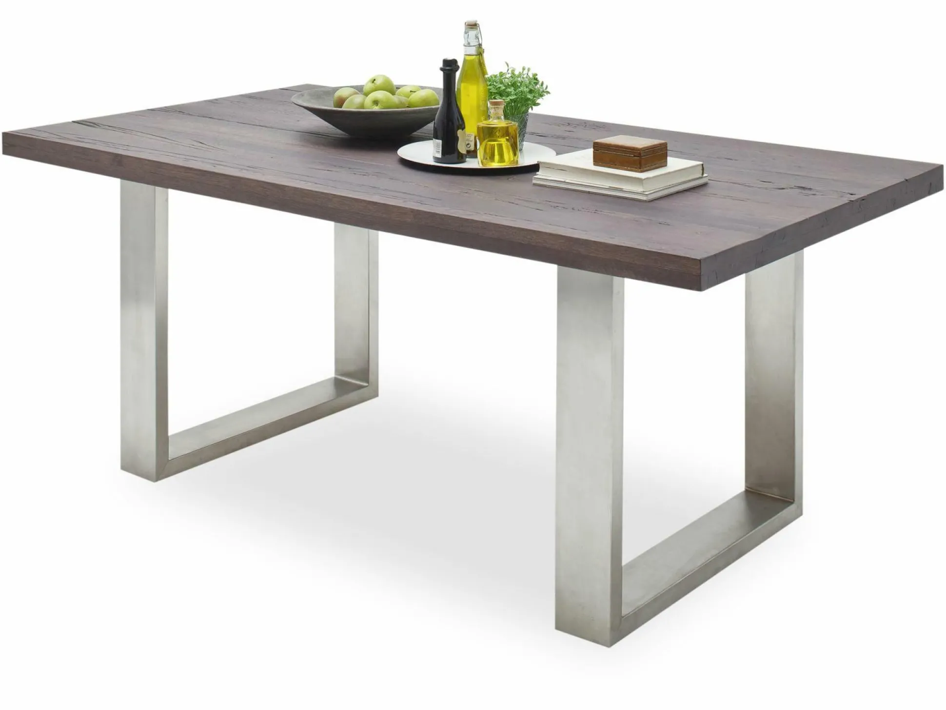 Der Esstisch Castello überzeugt mit hochwertigem Material und modernem Design. Bei diesem Tisch besteht das u-förmige Gestell aus Edelstahl und die Tischplatte ergänzt sich im Verwitterten Braunton ideal dazu. Da dieser Tisch ein schickes, schlichtes Design besitzt, ist er mit vielen Möbeln kombinierbar. An diesem Esstisch können Sie schöne Stunden mit Ihren Liebsten verbringen und leckere Mahlzeiten verzehren. Bekanntlich verbindet gemeinsames Essen in einer gemütlichen Atmosphäre!