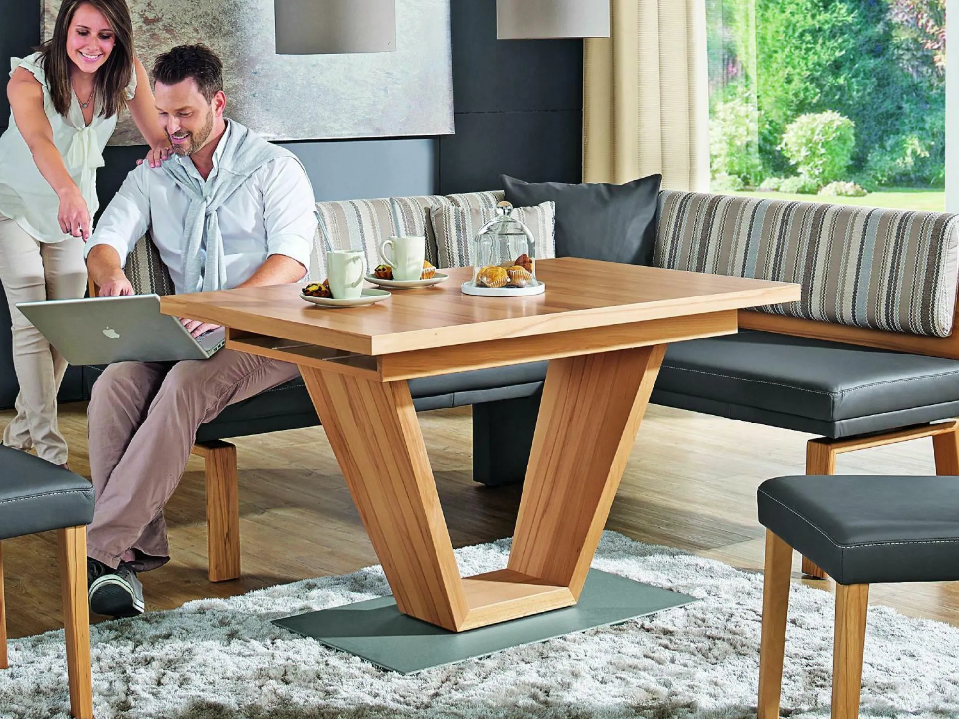 Mit einem außergewöhnlichen Design besticht der Esstisch Match aus dem Hause Variano. Durch seine schicke Optik schafft er ein echtes Highlight in Ihrem Essbereich, welches Familie und Freunde staunen lassen wird. Der Tisch ist aus Echtholzfurnier und lackierter Kernbuche gefertigt. Die V-Säule aus Holz und die Bodenplatte aus MDF mit Edelstahldekor ummantelt sorgen für einen festen Stand. Dank der innenliegenden Schiebe- und Ansteckplatte von ca. 48 cm lässt sich der Tisch auf ca. 168 cm ausziehen und bietet somit genügend Platz für Ihren Besuch.