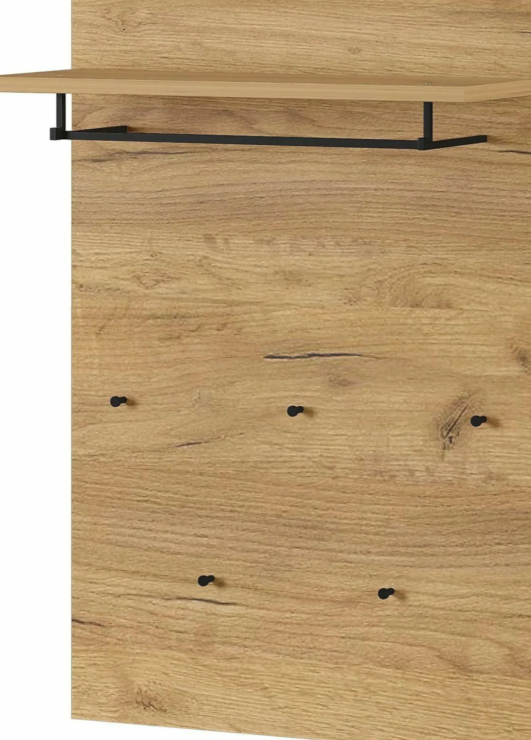 · Garderobenpaneel mit einem Ablageboden (belastbar bis zu 10 kg), einer Kleiderstange aus Metall in Schwarz (belastbar bis zu 10 kg) und fünf Kleiderhaken aus Metall in Schwarz (jeweils belastbar bis zu 3 kg), im Dekor Navarra-Eiche-Nb., hochwertige ABS-Kanten, Melaminharzbeschichtung, Made in Germany.