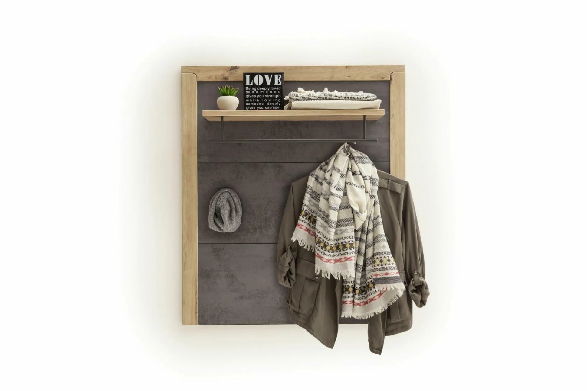 Das Garderobenpaneel Incata von vito erscheint in einem klar konzipierten, modernen Design. Das Element besteht dabei aus Balkeneiche Melamin Nachbildung mit Absetzungen in Oxid Melamin Nachbildung. An einer Kleiderstange und mehreren Haken können Sie Jacken, Taschen und weitere Textilien aufhängen. Auf einer Ablage ist Platz für Hüte und Deko. So bleibt der Eingangsbereich jederzeit ordentlich.