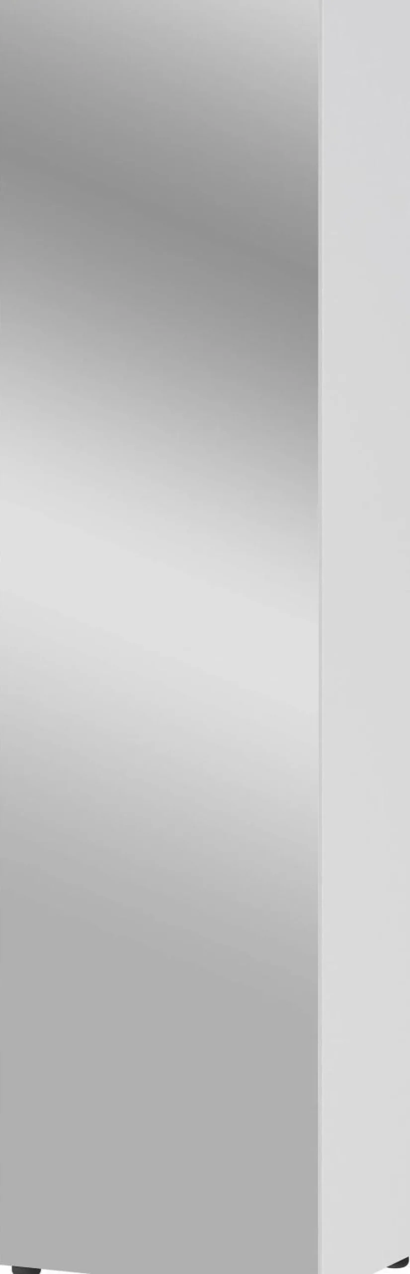 · Garderobenschrank mit komplett verspiegelter Tür – dahinter vier verstellbare Einlegeböden und ein fester Einlegeboden (je belastbar bis zu 10 kg), Unterboden belastbar bis zu 10 kg, ausziehbare Kleiderstange belastbar bis zu 7 kg, Griff aus Metall in Silber, vier Möbelgleiter aus Kunststoff in Schwarz, im Dekor Weiß, Melaminharzbeschichtung, Türdämpfung, verstellbare Einlegeböden, Tür beidseitig montierbar, ausziehbare Kleiderstange, Made in Germany.
