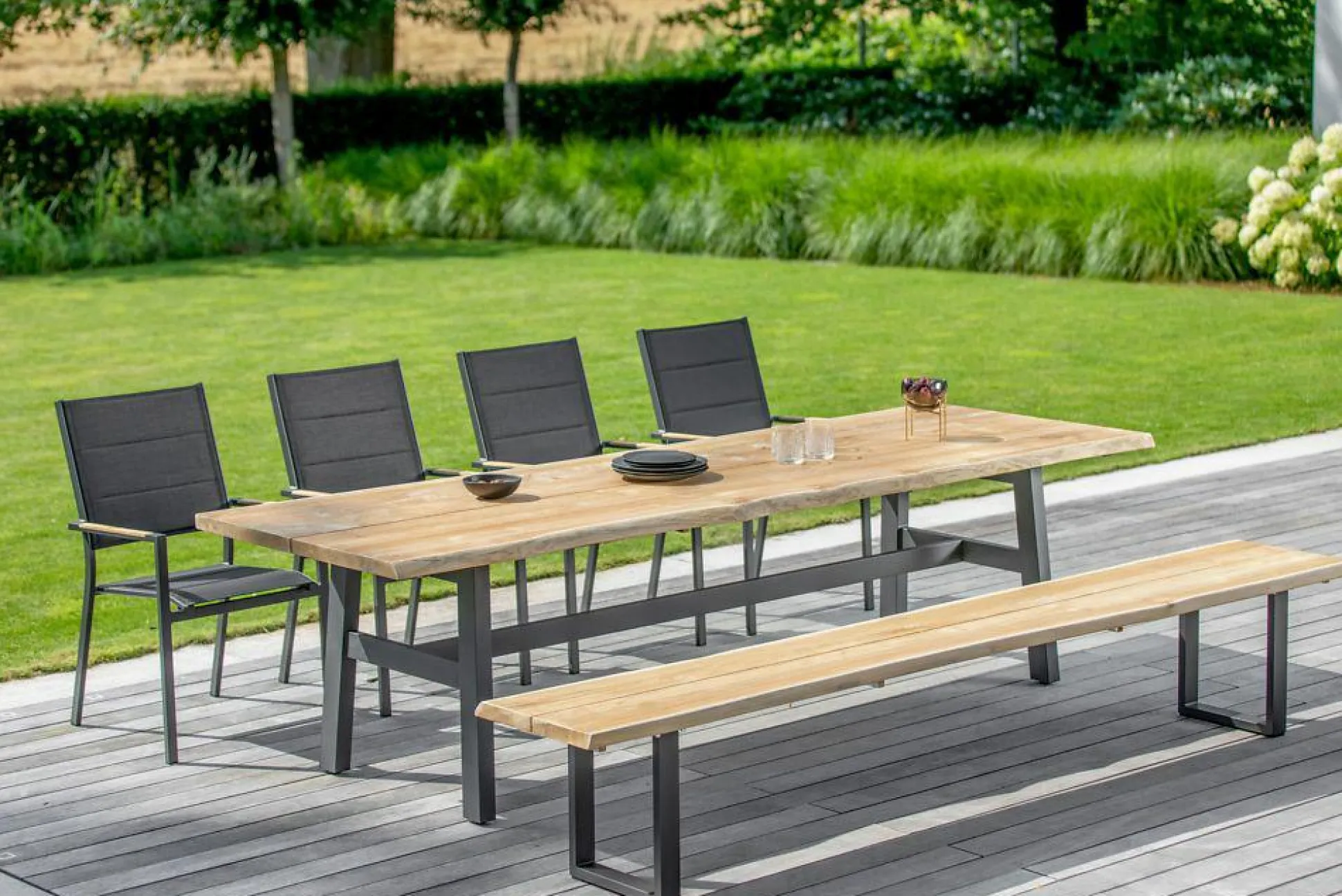 · Bank TAVO Sitzfläche Teak gebürstet mit Baumkante, Gestell Aluminium pulverbeschichtet, Farbton anthrazit, B 240 T 45 H 46 cm
