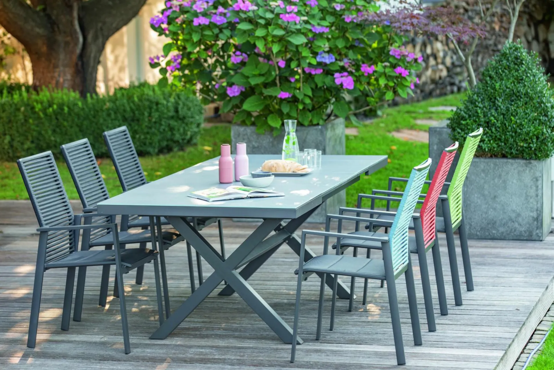 · Ausziehtisch NALVO Tischplatte ES-Glasauflage hellgrau mit Oberflächenstruktur mit 6 (8) Segmenten, X-Gestell mit Verbindungssteg Aluminium pulverbeschichtet, Farbton anthrazit, 180(240)x100 / 76 cm
