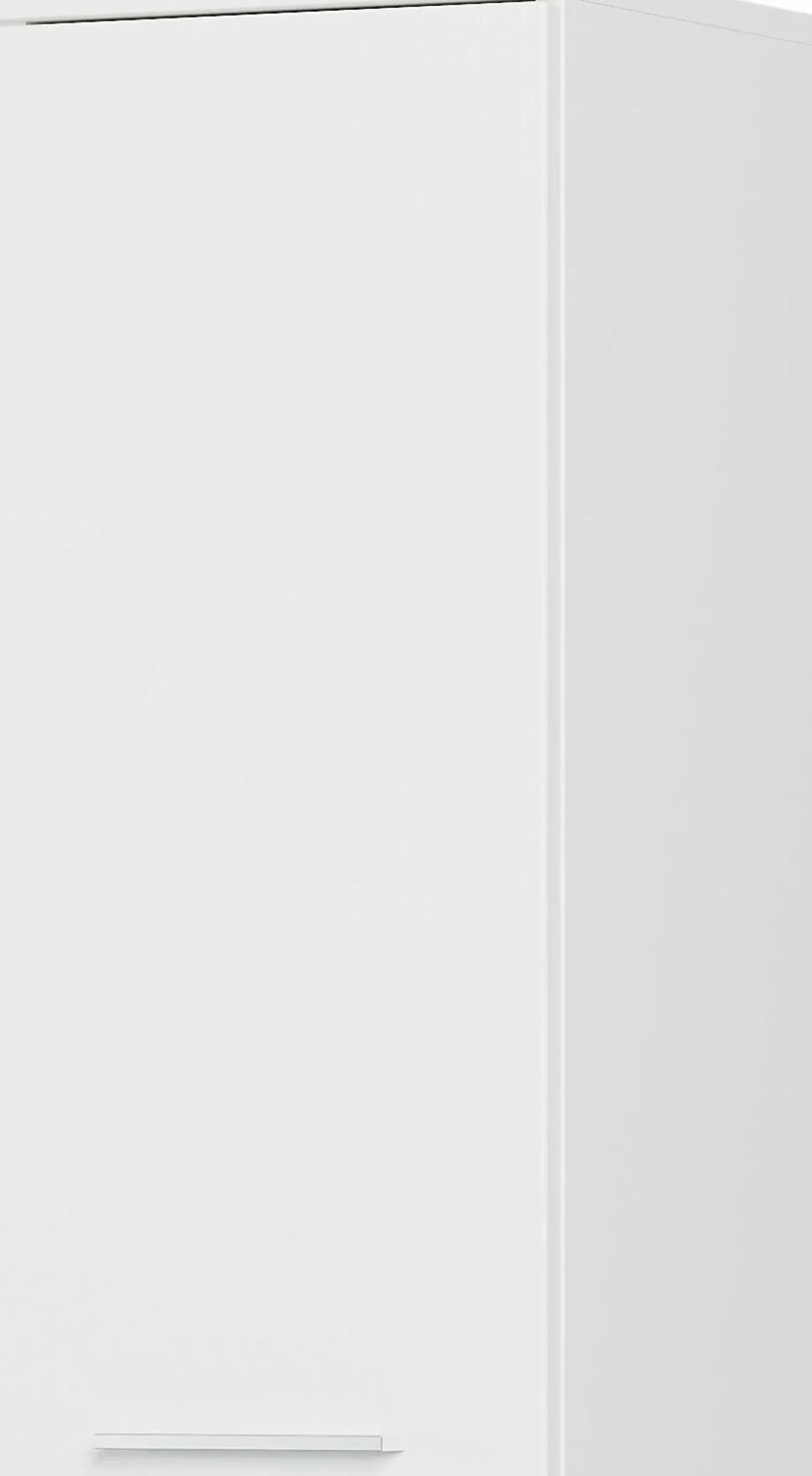 · Hängeschrank mit einer Tür – dahinter zwei verstellbare Einlegeböden (je belastbar bis zu 10 kg), Unterboden belastbar bis zu 10 kg, in Weiß, ein Steggriff aus Metall (chromfarben), Front MDF-tiefgezogen und supermatt, Melaminharzbeschichtung, Türdämpfung, Made in Germany