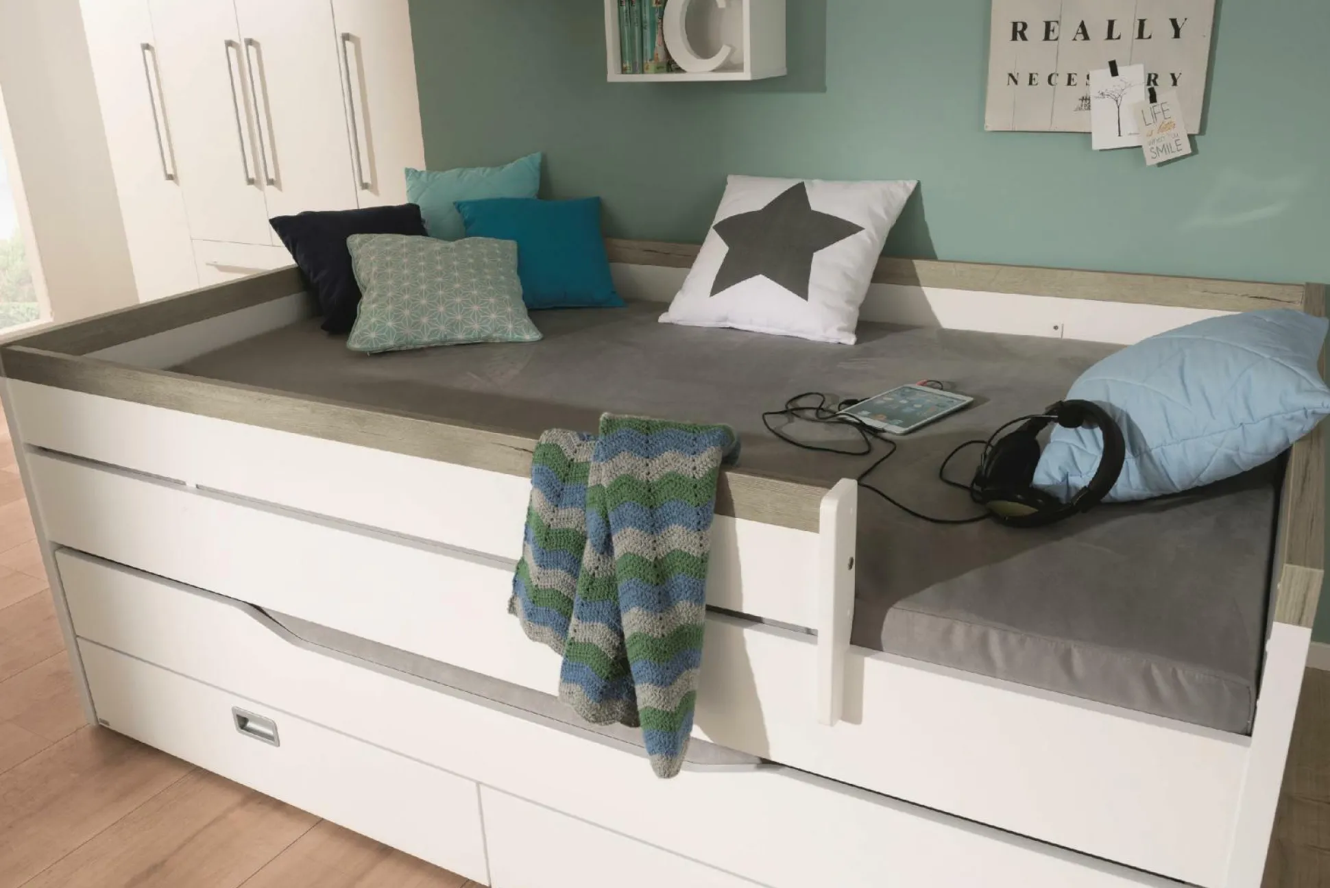 Schutzseite, Absturzsicherung, Lattenrost, Matratze und Betttextilien sowie ein passendes Unterschiebebett sind separat erhältlich.
