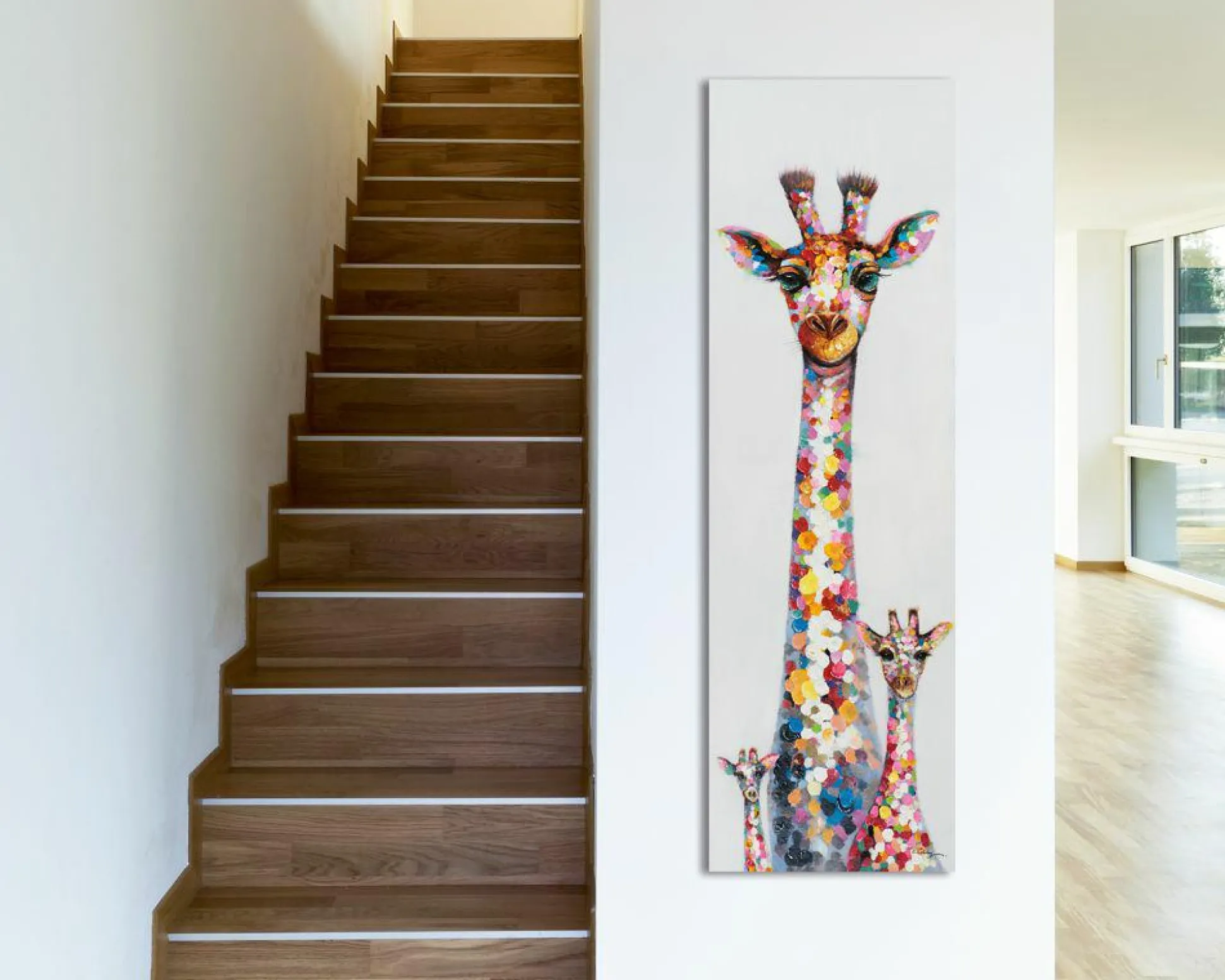 Das Bild Giraffen zeigt eine künstlerische Abbildung von einer Großen und zwei kleinen Giraffen vor weißem Hintergrund. Auf Holz gezogen, erscheint das Bild in vielen verschiedenen Farben und erzeugt durch die spezielle malerische Art eine freundliche Atmosphäre im Raum. Setzen Sie mit diesem bunten Bild einen besonderen Akzent an der Wand!