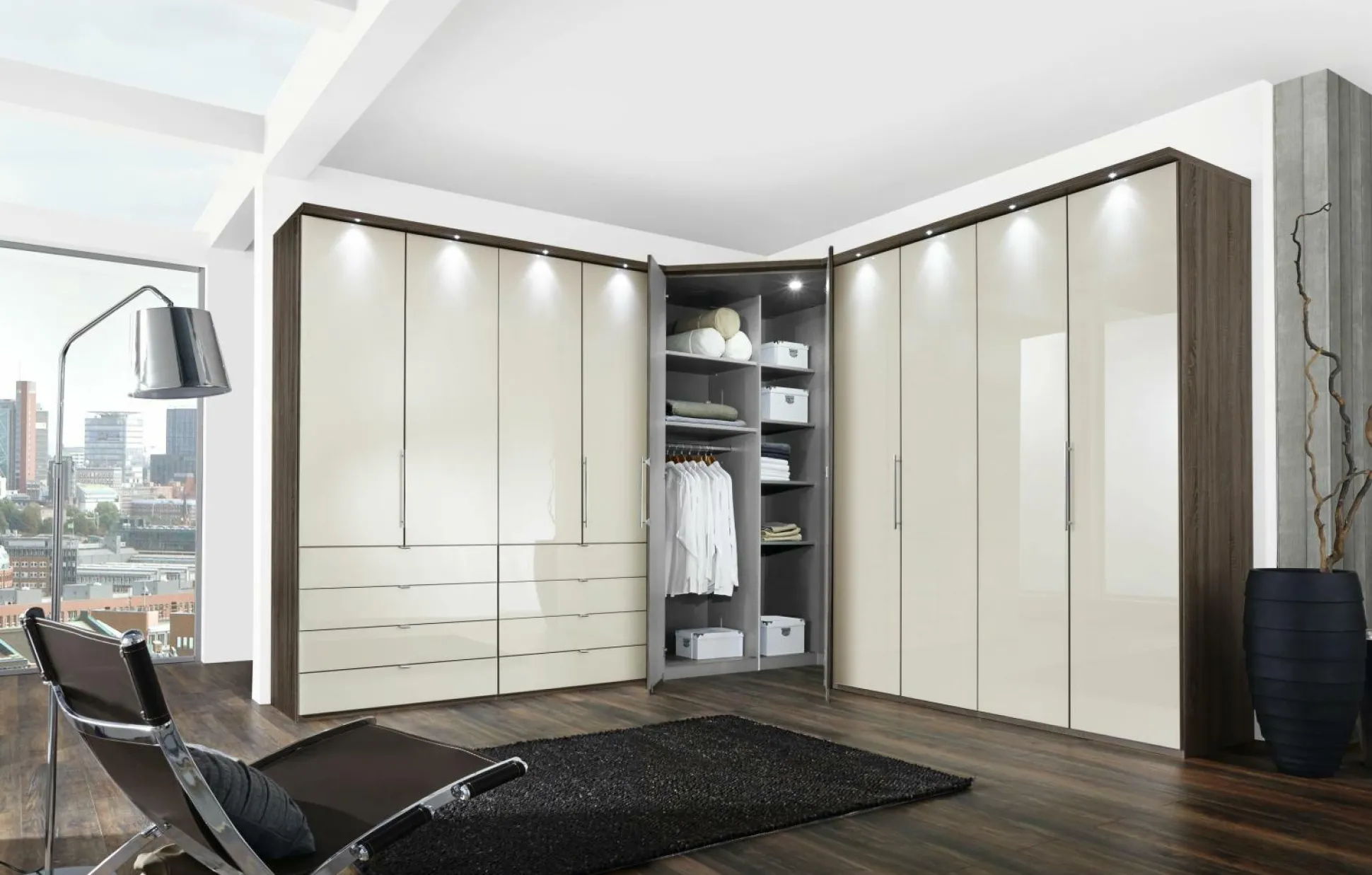 Schaffen Sie Platz und Ordnung mit dem Kleiderschrank 430 aus dem Hause Rolf Weber. Das dezente Design ist ideal um es in viele Schlafzimmer zu integrieren und ist dabei trotzdem ein echtes Highlight. Der Korpus ist aus Eiche bianco gefertigt, zusammen mit der Front aus weißem Glas, wird ein schicker Kontrast geschaffen, der das Design des Gleittüren-Panorama-Funktionsschranks perfekt abrundet. Für reichlich Stauraum sorgen dabei zusätzlich links und rechts unten je drei Auszüge.
