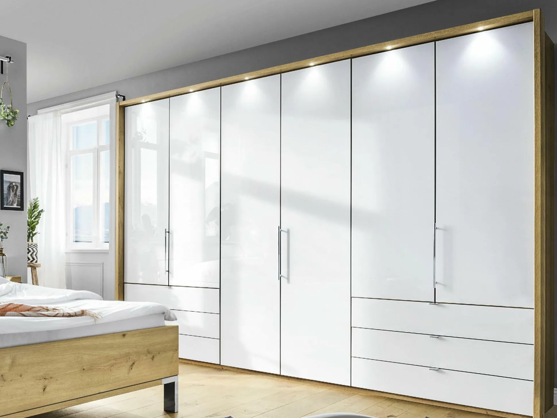 6trg., Gleittüren-Panoramaschrank Korpus 329 Bianco-Eiche-Nachb. Front Glas weiß Ohne Passepartout, Schubkästen und Beleuchtung, Loft
