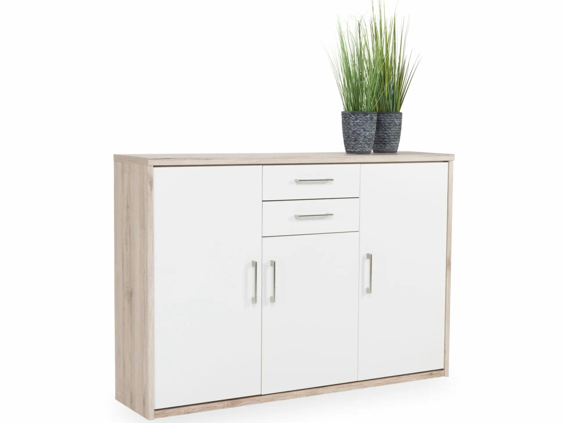 Die Kommode Achat aus dem Hause priess begeistert mit einem schlichten, aber dennoch schicken Design, das sich wunderbar in Ihr Zuhause integrieren lassen wird. Der Korpus ist aus San Remo Eichen Dekor gefertigt. Passend dazu ist die Front aus einem lichtweißen Dekor, der dabei entstehende Kontrast rundet das Design perfekt ab. Die Anrichte kommt mit drei Türen mit fünf verstellbaren Böden und zwei Schubkästen und hält somit ausreichend Stauraum bereit.
