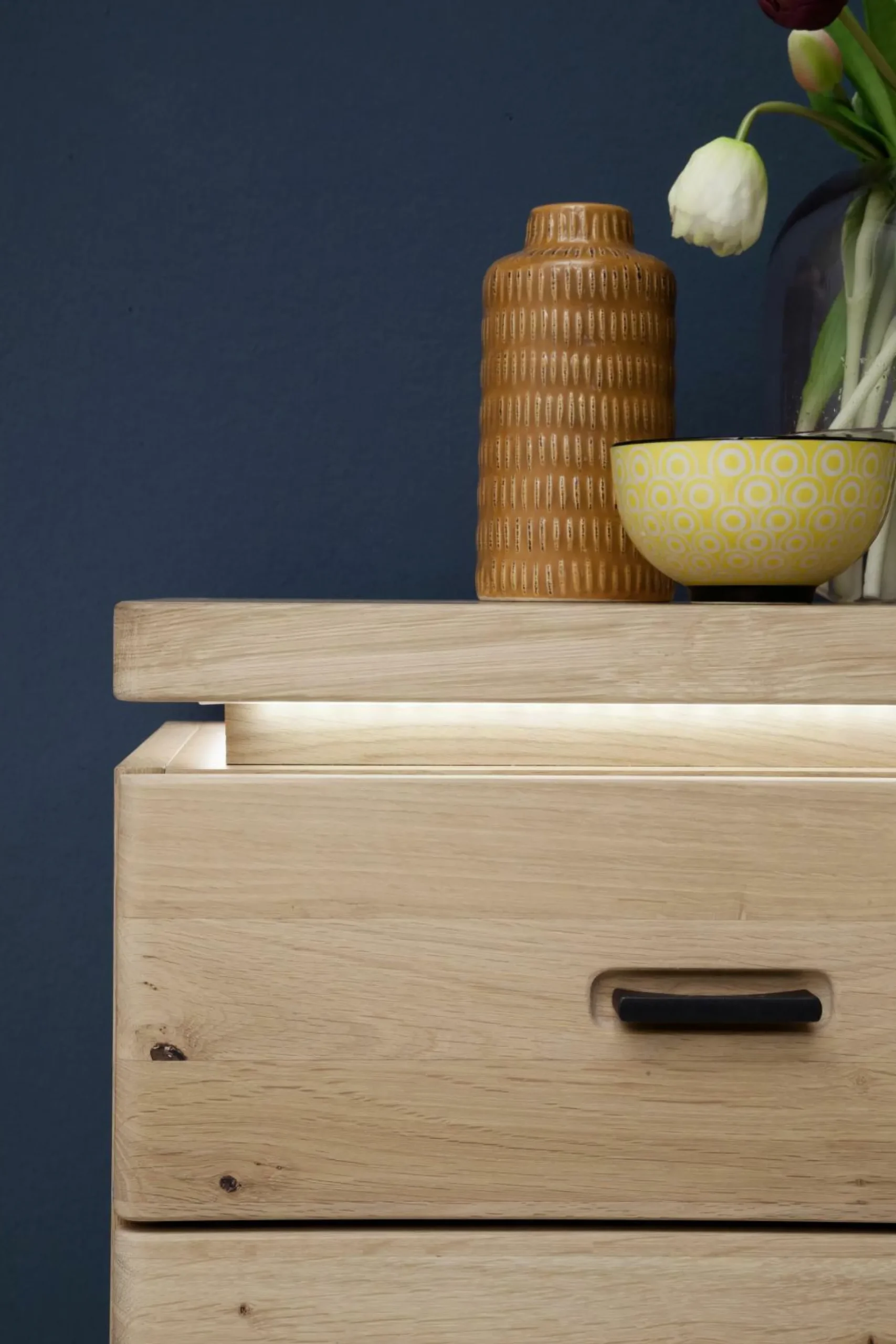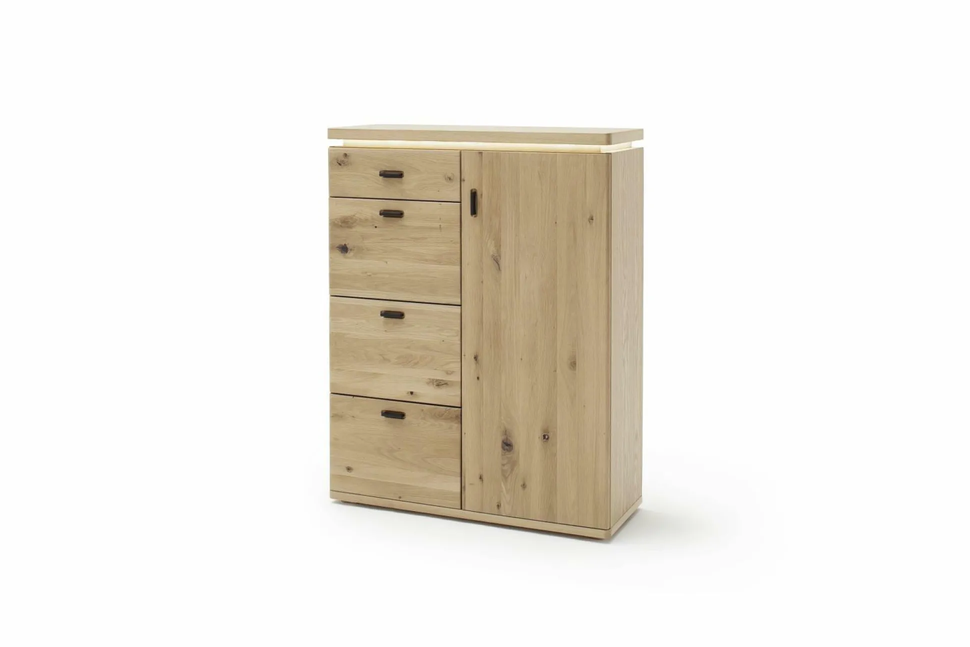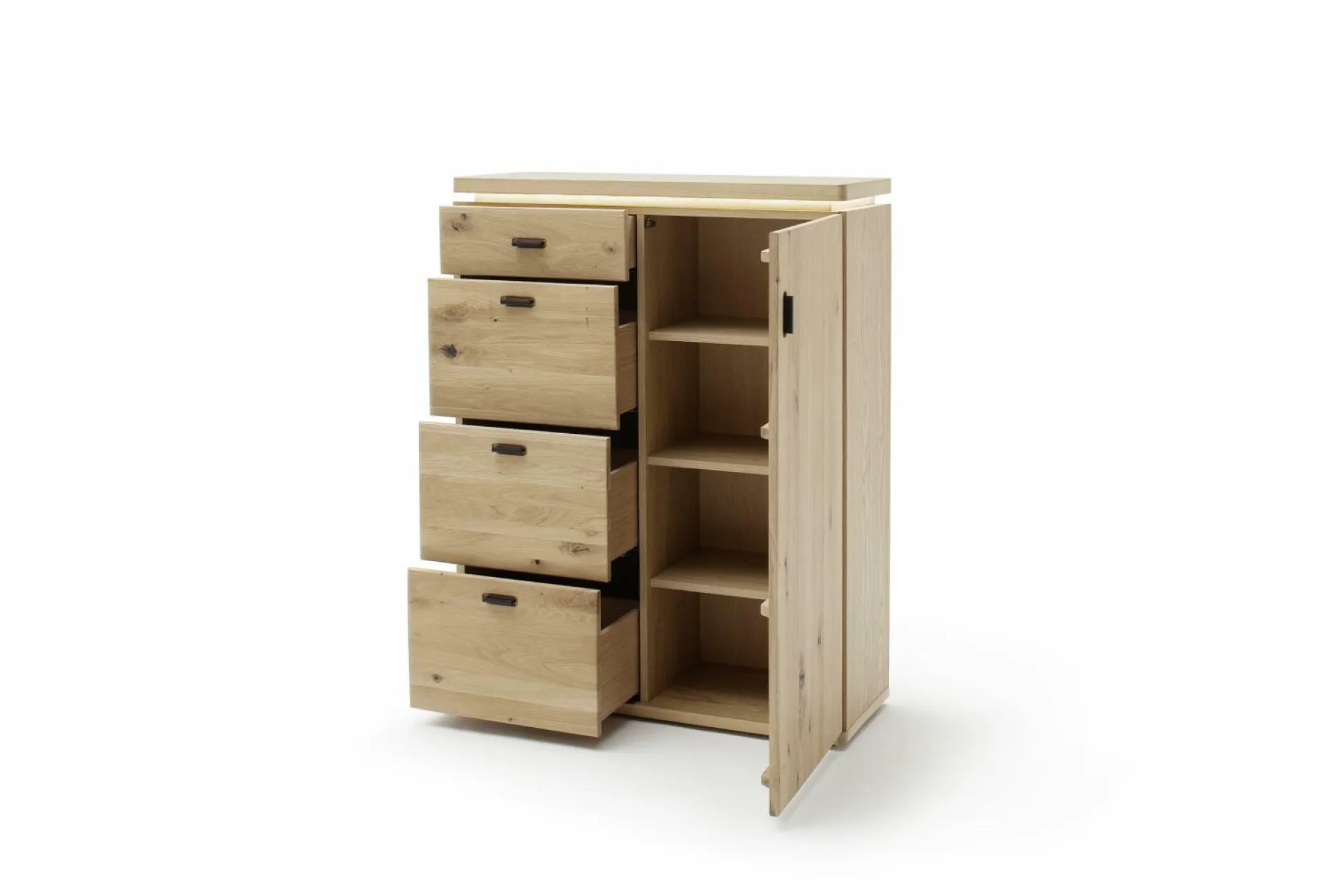 Die Kommode Madrid aus dem Hause HARPER wird die Natur ein Stück näher in Ihr Zuhause bringen und dabei für eine wohnliche Atmosphäre sorgen. Der Korpus ist aus furnierter Eiche bianco gefertigt und wird von einer Front aus Balkeneiche Bianco massiv mit durchgehenden Lamellen ergänzt. Die Oberflächen sind geölt. Die Rückwand hinter Türen und Schubkästen besteht aus Balkeneiche Nachbildung. Für ein abgerundetes Gesamtdesign sind die Griffe aus schwarzgrauem Metall gefertigt. Die vier Schubkästen sind mit einer gedämpften Unterflurführung ausgestattet. Die eine Tür mit Türdämpfung und drei Einlegeböden bieten ausreichend Stauraum für Ihr Hab und Gut. Die Kommode kommt zusätzlich mit einer LED-Beleuchtung.