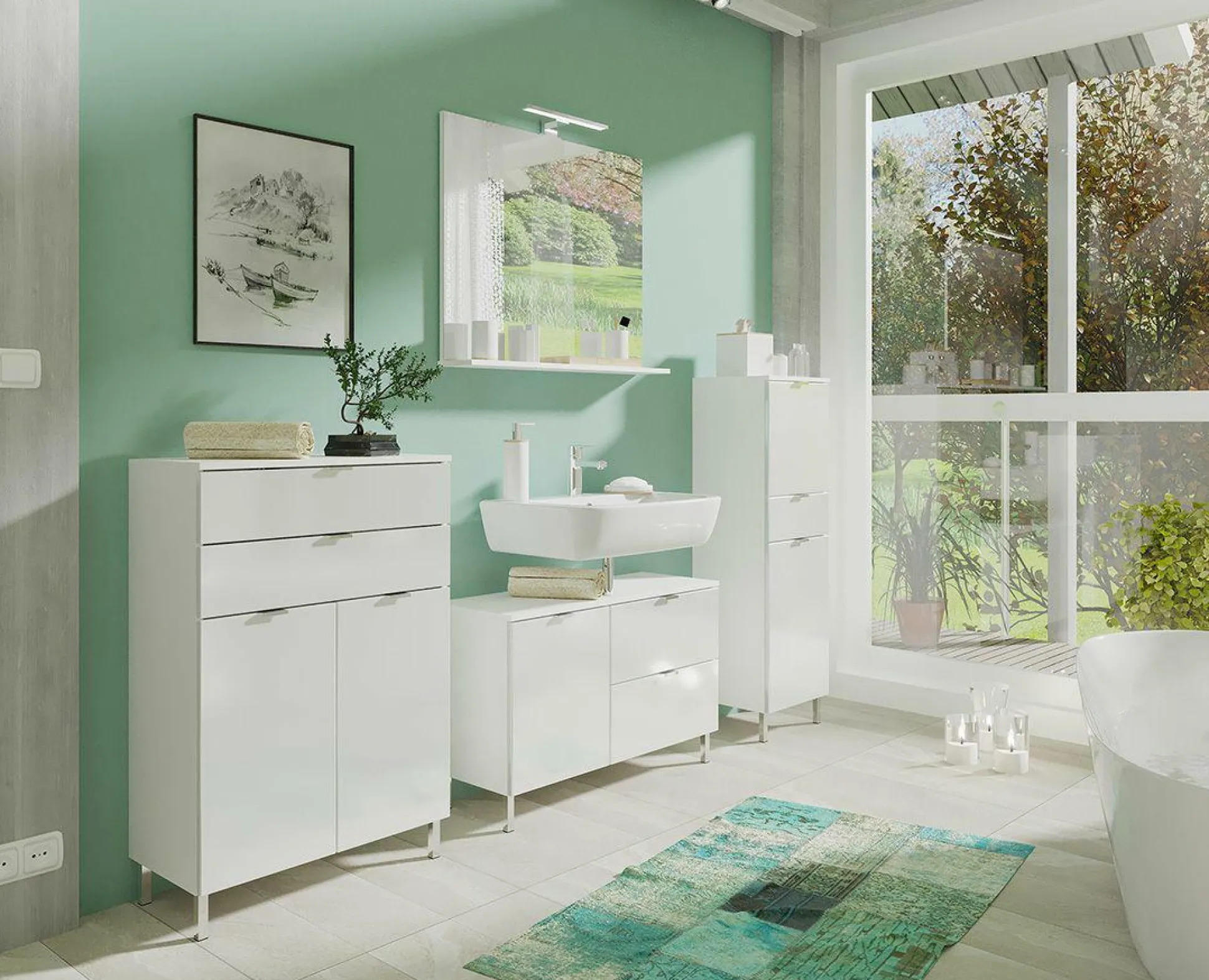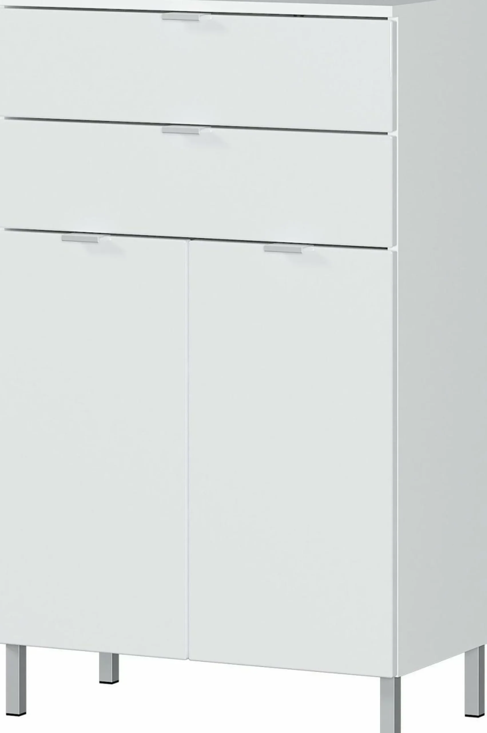 · Kommode mit zwei Schubladen (belastbar bis zu 10 kg) und zwei Türen – dahinter zwei verstellbare Einlegeböden (belastbar bis zu 10 kg), Oberboden belastbar bis zu 10 kg, Korpus in Weiß, Fronten in Weiß, vier Kantengriffe und vier Füße aus Metall in der Farbe Chrom,Korpus Melaminharzbeschichtung, hochwertige ABS-Kanten, Fronten MDF-tiefgezogen und hochglänzend, Türdämpfung, Selbsteinzug der Schubladen, Made in Germany
