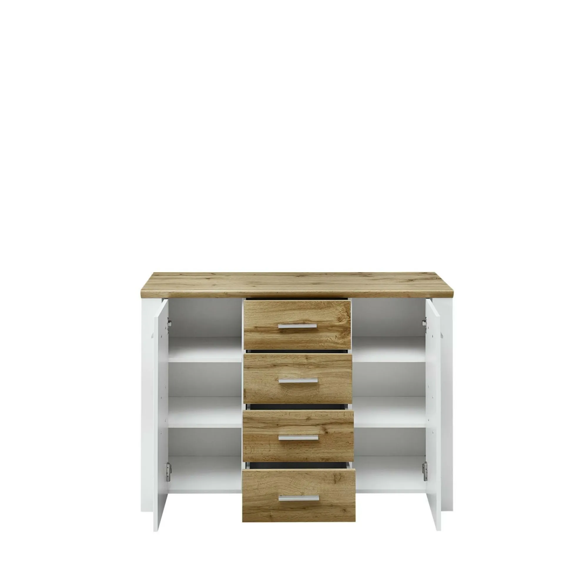 Werten Sie Ihren Wohnraum mit der Kommode Materio aus dem Hause vito auf. Das wohnliche Design ist ein echter Hingucker und wird Freunde und Familie staunen lassen. Die Front ist aus Lack Laminat weiß in supermatt gefertigt und wird von einem mattweißen Korpus vervollständigt. Die Absetzungen aus Hirnholz Nachbildung und Eiche Altholz Nachbildung sorgen für ein echtes Highlight. Die Kunststoffgriffe in Chrom matt runden das Design perfekt ab. Die Anrichte kommt mit zwei Türen mit Softclose und 4 Einlegeböden und vier Schubkästen, ebenfalls mit Softclose und Selbsteinzug.