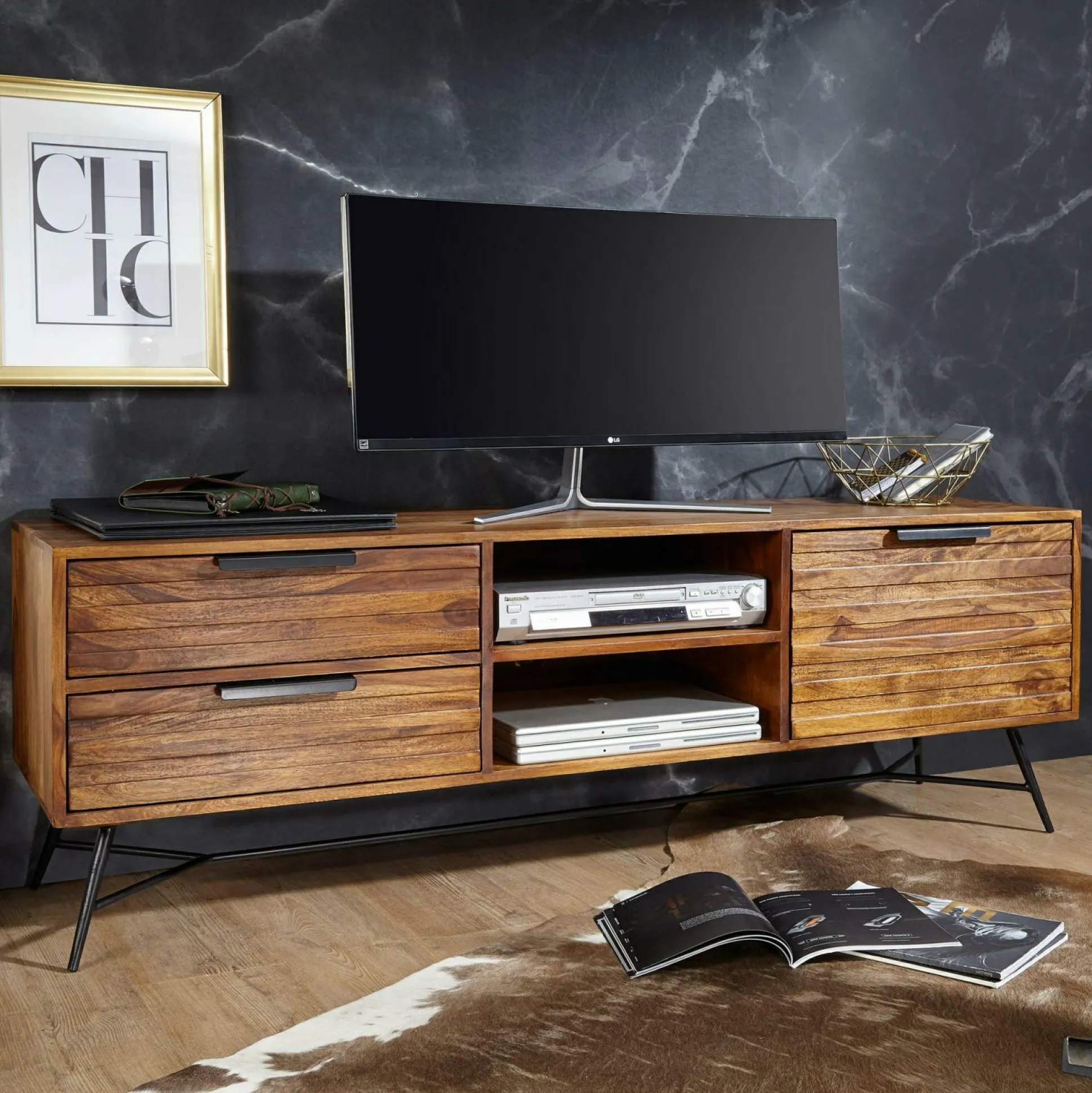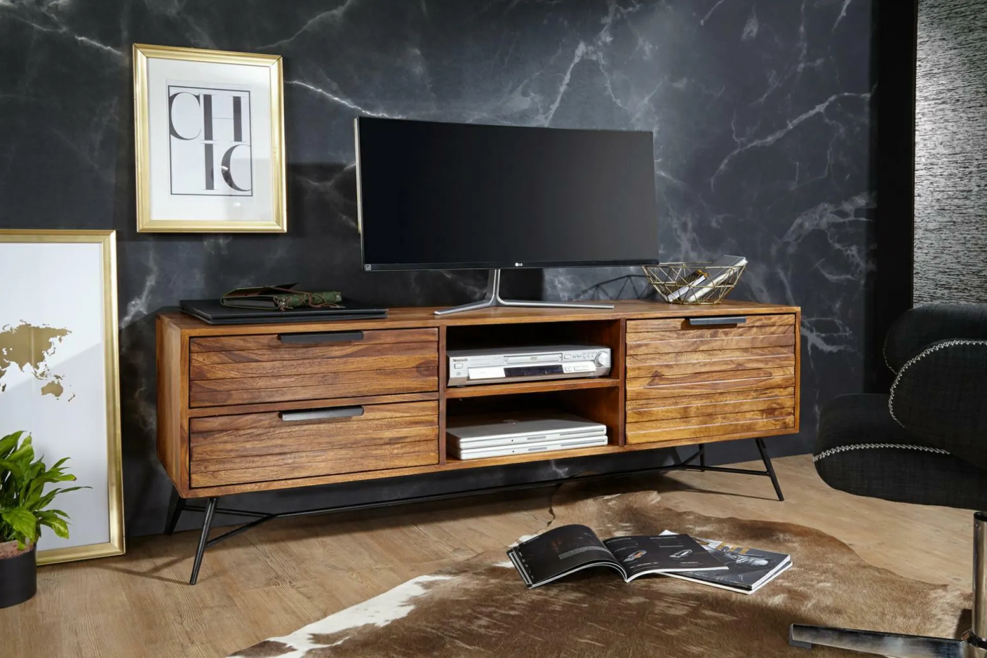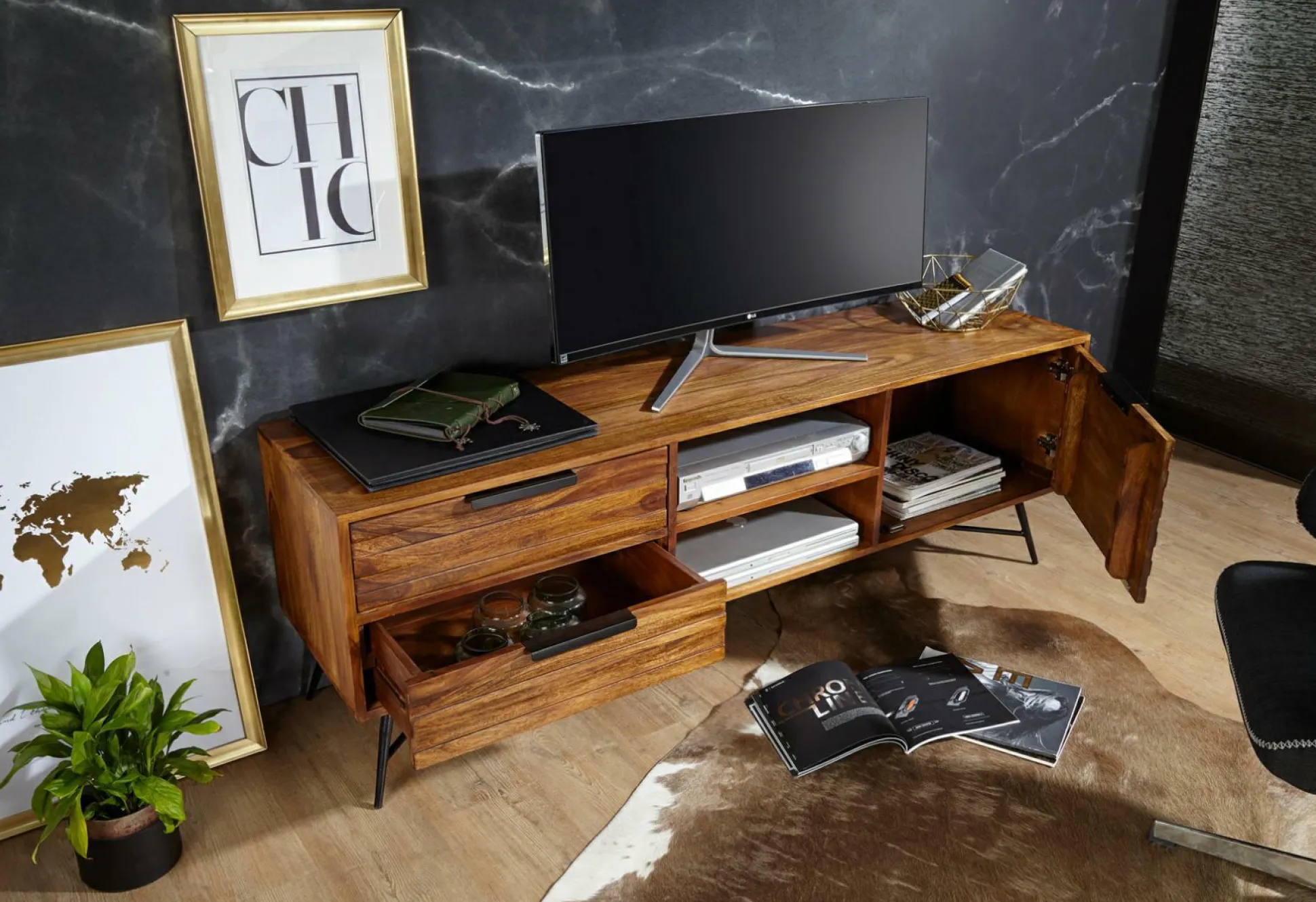 · Lieferung & Montage – Geliefert wird ein TV-Lowbord ohne Dekoration.