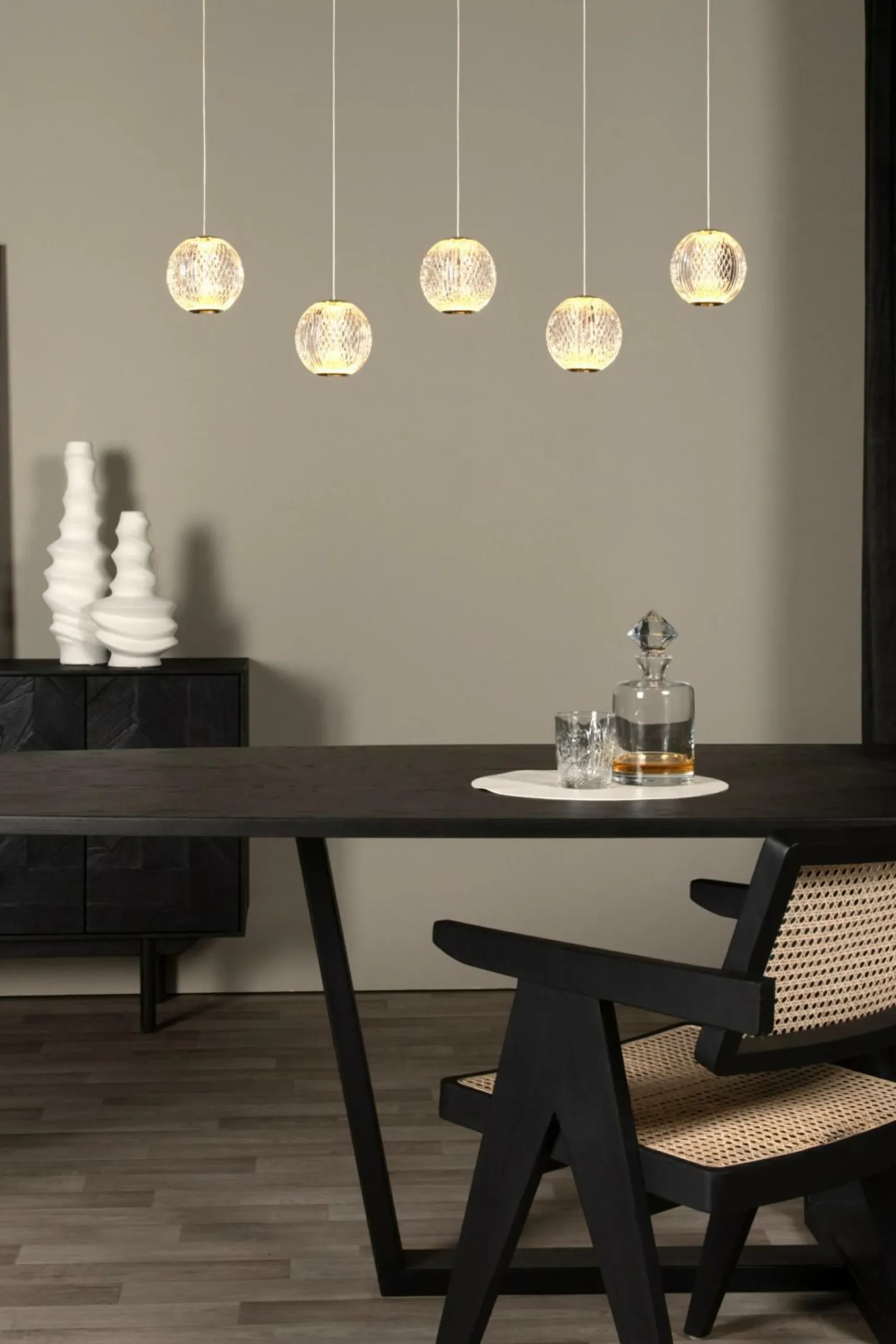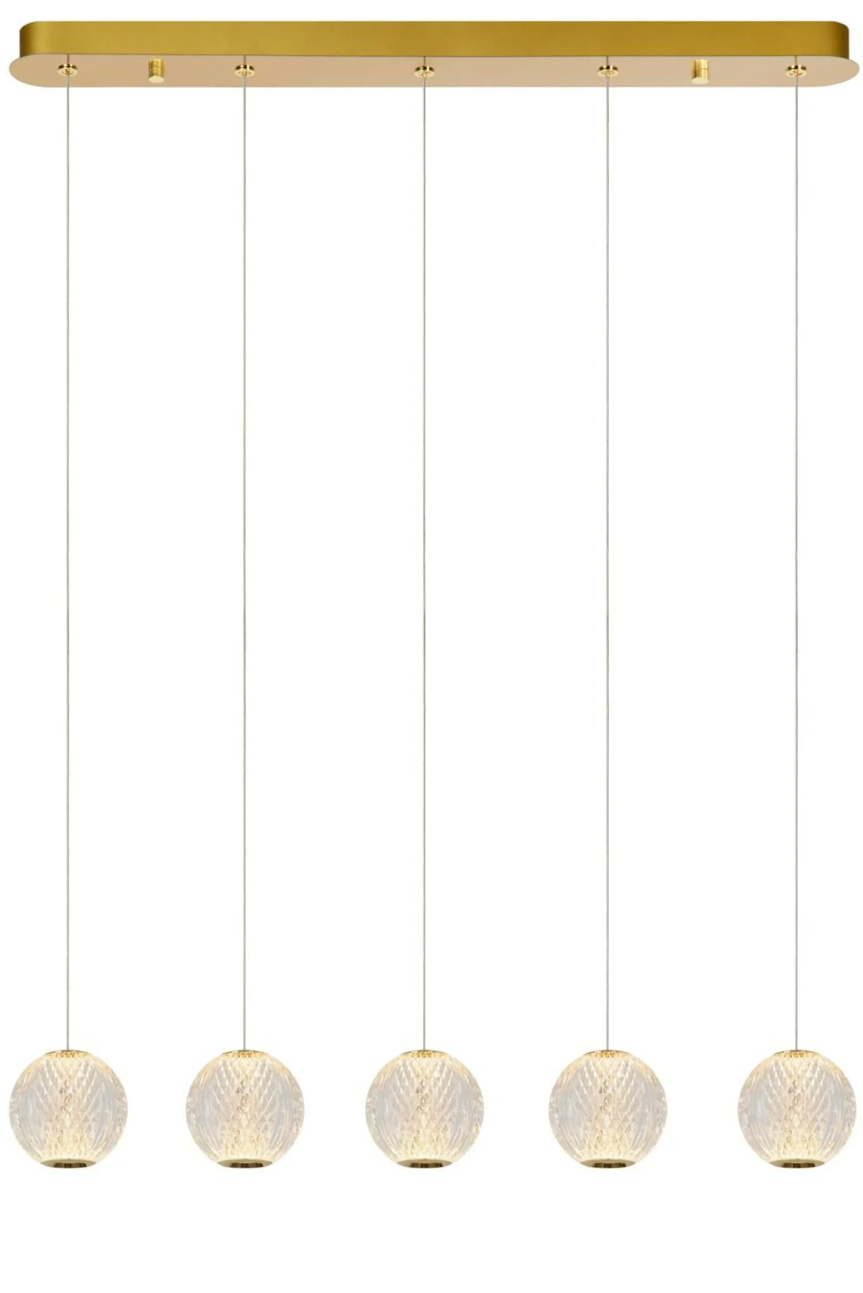 · Lassen Sie sich von den Pendeln von Cintra in einer eleganten Linie verführen. Die kugelförmigen Lampenschirme aus transparentem Acryl ähneln durch ihre typischen Rillen echtem Kristall. Ein echter Hingucker über dem Esstisch oder in Ihrem Wohnzimmer. Diese Pendelleuchte ist höhenverstellbar und mit einer Größe von 11 x 11 x 9,8 Zentimetern passen die transparenten Lampenschirme perfekt in Ihren Raum. Die Messingdetails vervollständigen das Erscheinungsbild. Genießen Sie die integrierte, dimmbare LED-Lampe als zusätzlichen Bonus dieser funkelnden Lichtquelle.