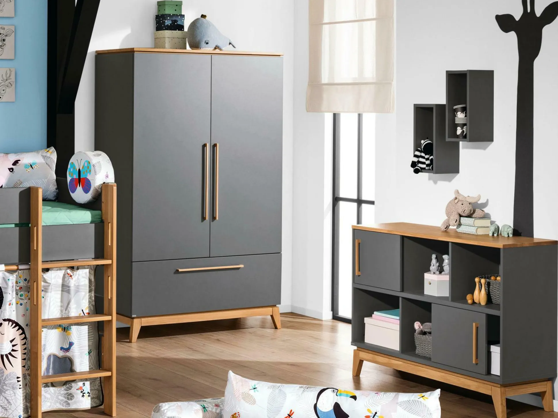 Das Regal Sten von PAIDI ist ein trendig gestaltetes Element für das Jugendzimmer. Front und Korpus erscheinen in Schiefergrau und werden von einer Deckplatte, Griff und Sockel aus massiver Eiche abgerundet. Die schicke Kombination lässt sich mit weiteren Stilen kombinieren. Das Regal verfügt über sechs Fächer und zwei Schiebetüren, in denen Spielzeug, Bücher und sonstige Sachen ordentlich aufbewahrt werden können. Die Schiebetüren können ganz von links nach rechts durchgeschoben werden.