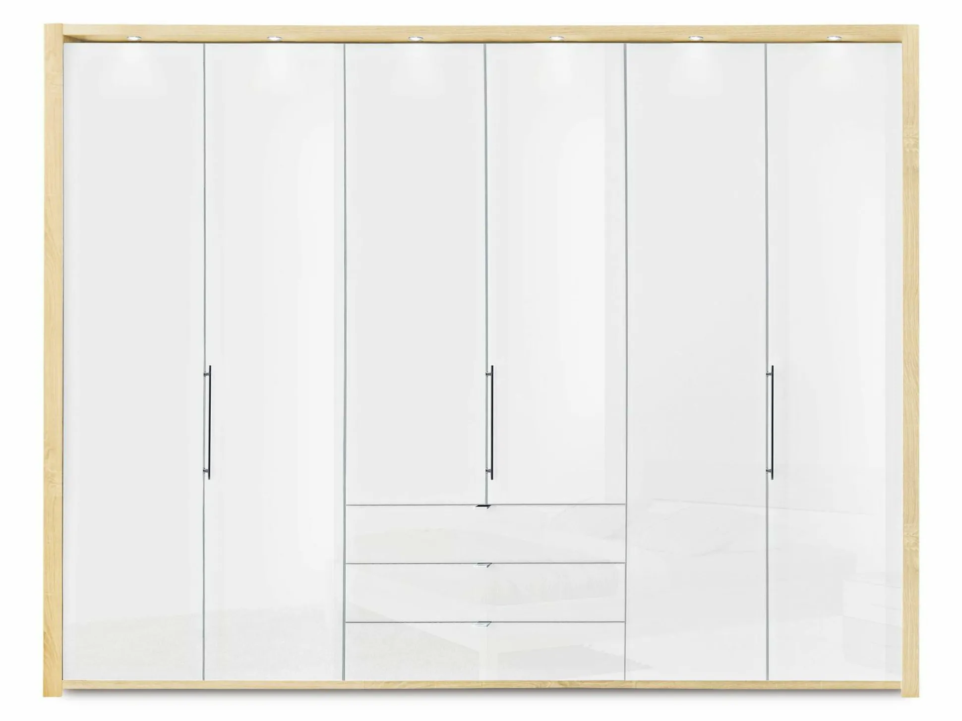 Ausf.: 313 Eiche-Sägerau-Nachbildung, Front in Glas weiß, bestehend aus: Gleittüren-Panorama-Funktionsschran k mit rechts BHT ca. 300/216/58 cm Innenausstattung: 2 Böden und 1 Kleiderstange je Fach, Futonbett mit Querleisten, Liegefläche 200 x 200 cm, Kopfteilhöhe ca. 92 cm, Flachfüße in chrom, BHT ca. 60/37/42 cm, Matratzen, Rahmen, Zubehör, Beleuchtung und Nachtkonsolen-Paneel auf Wunsch, Loft