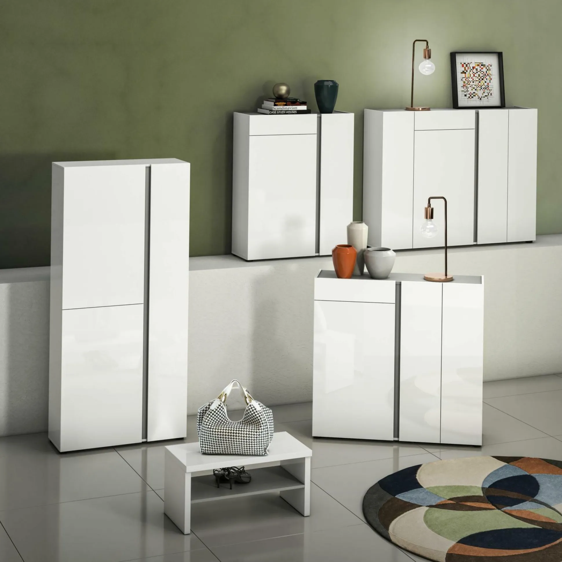 Der Schuhschrank ATRIUM ist die ideale Möglichkeit Platz und Ordnung in Ihrem Zuhause zu schaffen. Das schlichte, aber dennoch moderne Design integriert sich dabei in nahezu jedes Einrichtungskonzept. Front und Korpus sind aus Hochglanz weiß lackiertem Dekor gefertigt. Die Griffleisten in anthrazit schaffen dabei einen Kontrast, der das Design perfekt abrundet. Der Schrank kommt mit zwei Türanschlägen links und einem rechts, sowie vier Einlegeböden links und zehn Böden rechts. Die Türen sind mit D0ämpfern versehen und ermöglichen somit ein sanftes Schließen.