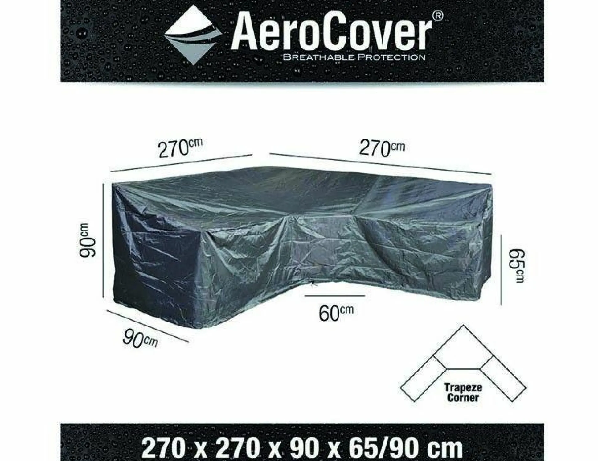 · Eck-Lounge-Hülle von AeroCover. Atmungsaktive Eck-Lounge-Hülle für L-förmige Loungesets mit hoher Rückenlehne 270x270x90xH65/90 cm mit XL oder Trapez Ecke. Das atmungsaktive AeroCover-Gewebe ist wasserbeständig und reduziert die Kondensbildung, wodurch der Bildung von Schimmel vorgebeugt wird. AeroCover Schutzhüllen verlängern die Lebensdauer Ihrer Gartenmöbel. AeroCovers sind aus leichtem Ripstop Polyester mit einer integrierten, atmungsaktiven Membran hergestellt. Dank des dünnen Gewebes sind diese Hüllen besonders handlich in der Anwendung. Bei Nichtgebrauch sind sie platzsparend aufzubewahren und nehmen, auch dank der integrierten Aufbewahrungstasche, sehr wenig Platz ein. Die Hülle ist mit einem Zugband mit zwei Stoppern ausgestattet, so dass eine optimale Befestigung sichergestellt ist. Das AeroCover-Gewebe ist 100% wasserdicht, die Nähte sind spritzwasserfest.