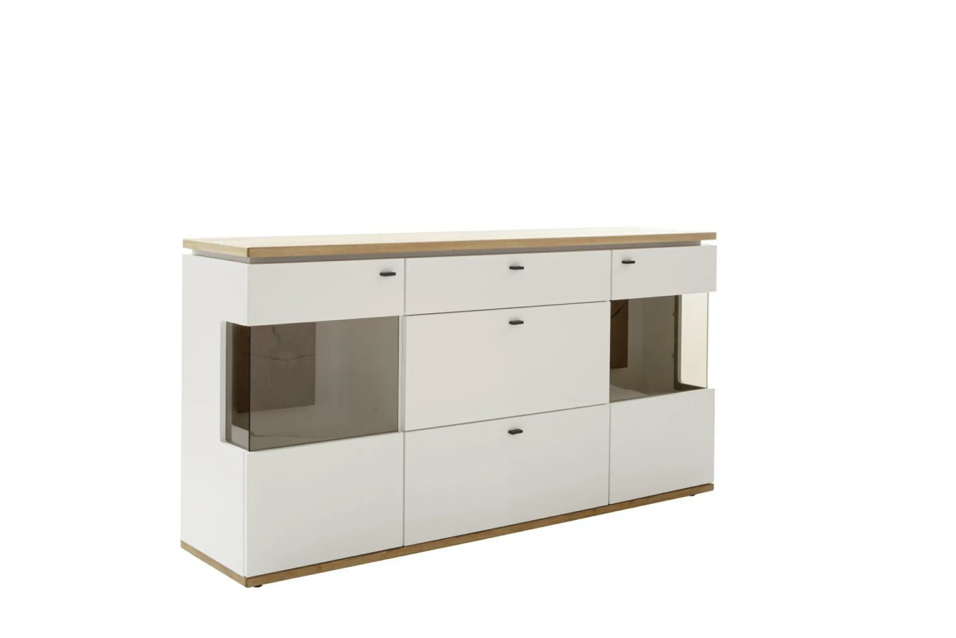 · zwei Türen mit Glas und Seitenverglasung links & rechts, drei Schubkästen mittig