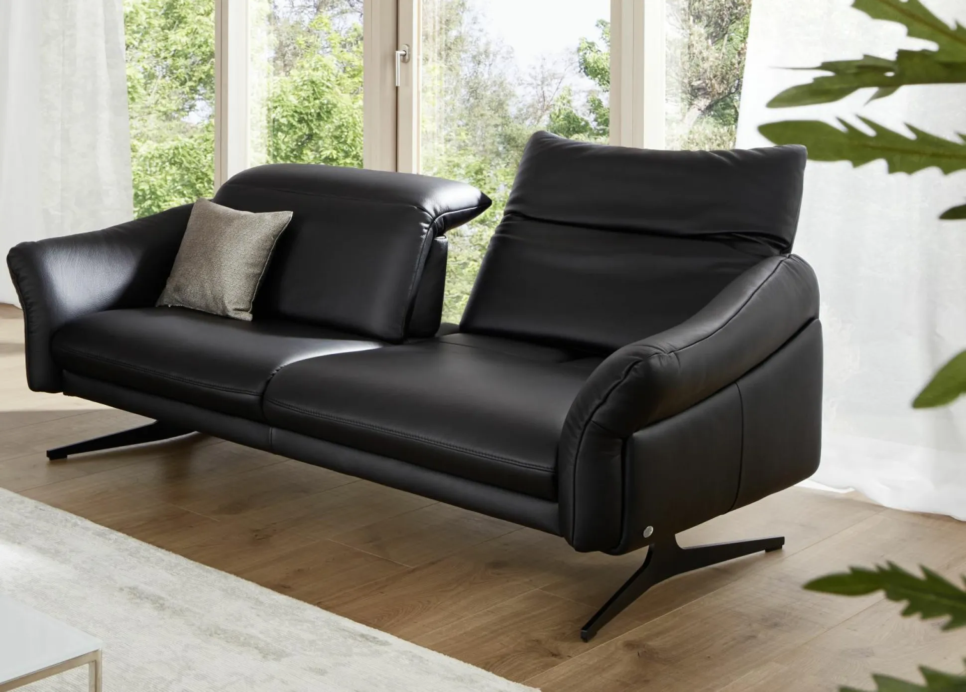 Das Sofa Himolla 1808 aus dem Hause himolla ist die ideale Möglichkeit Ihren Wohnbereich in eine echte Wohlfühloase zu verwandeln. Das dezente Design lädt dabei zu schönen Stunden zusammen mit Ihren Liebsten ein. Der 2,5-Sitzer ist mit einem schwarzen Lederbezug bezogen, der Rücken ist ebenfalls echt bezogen. Die pulverbeschichteten Metallfüße in anthrazit sorgen dabei für einen sicheren und stabilen Stand. Für angenehmen Sitzkomfort ist die Couch mit einer manuellen Sitztiefen- und Kopfteilverstellung ausgestattet, ergänzt wird dies durch einen Superlastic Sitz in soft. Der benötigte Wandabstand beträgt ca. 36 cm und die Sitzhöhe 43 cm.
