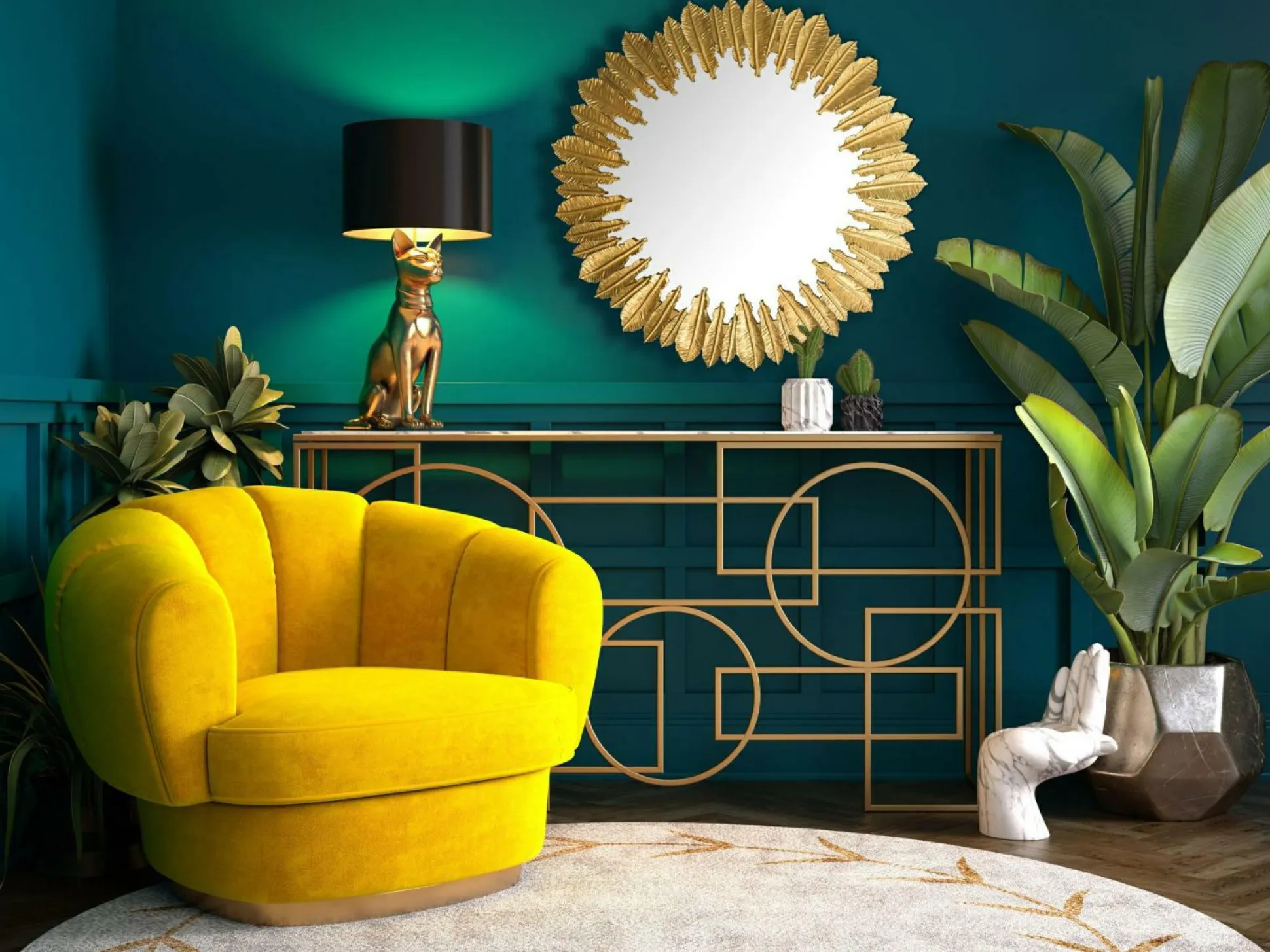 · Federpracht für die Wand – Setze einen eleganten Akzent mit unserem Wandspiegel, der von einer Umrahmung aus goldfarbenen Federn geziert wird.