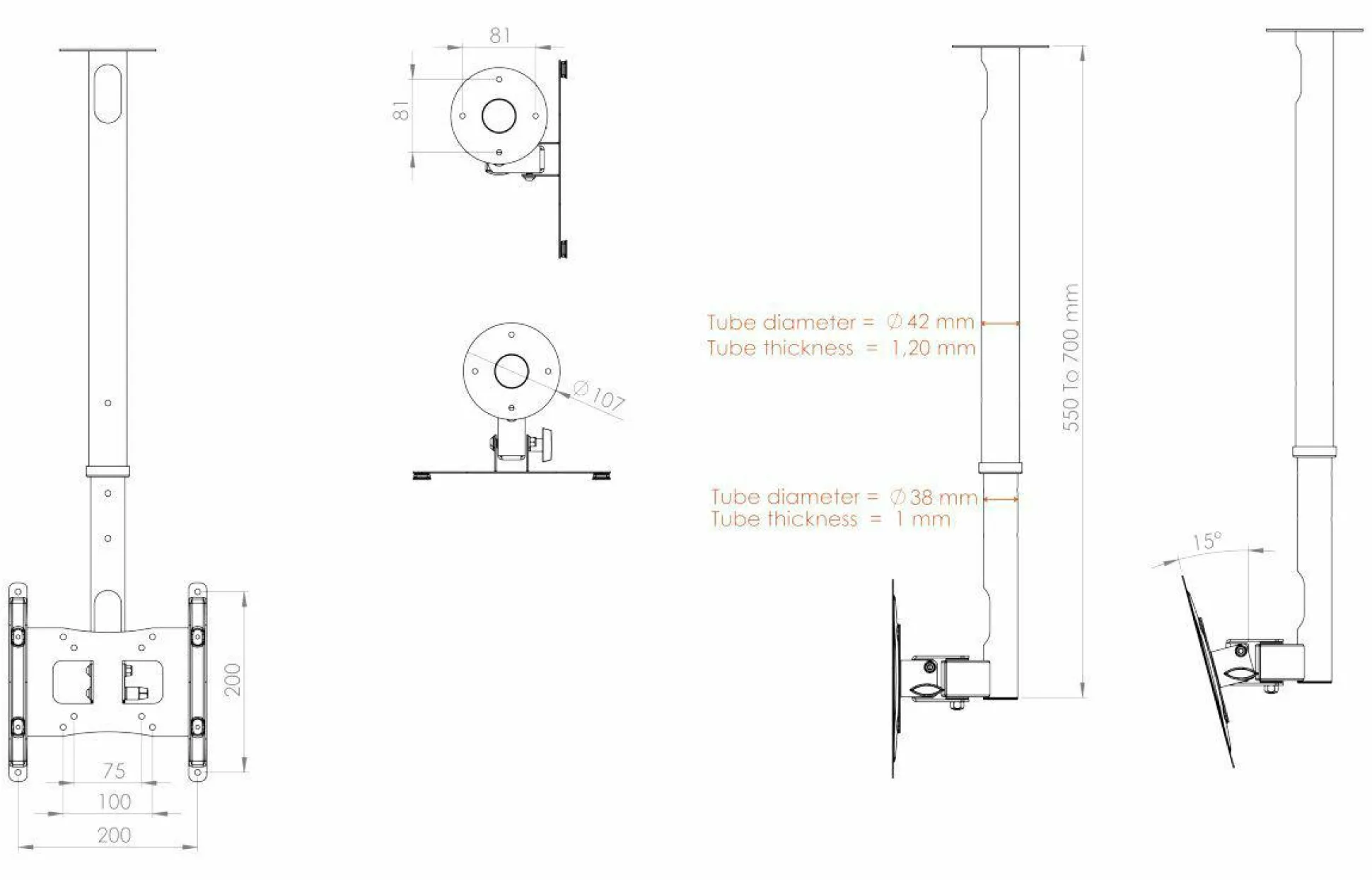 · VCM universelle Deckenhalterung DX 200“ für alle handelsüblichen Displays in den Größen von 26-40 Zoll (66-101 cm) bis max. 30 kg.