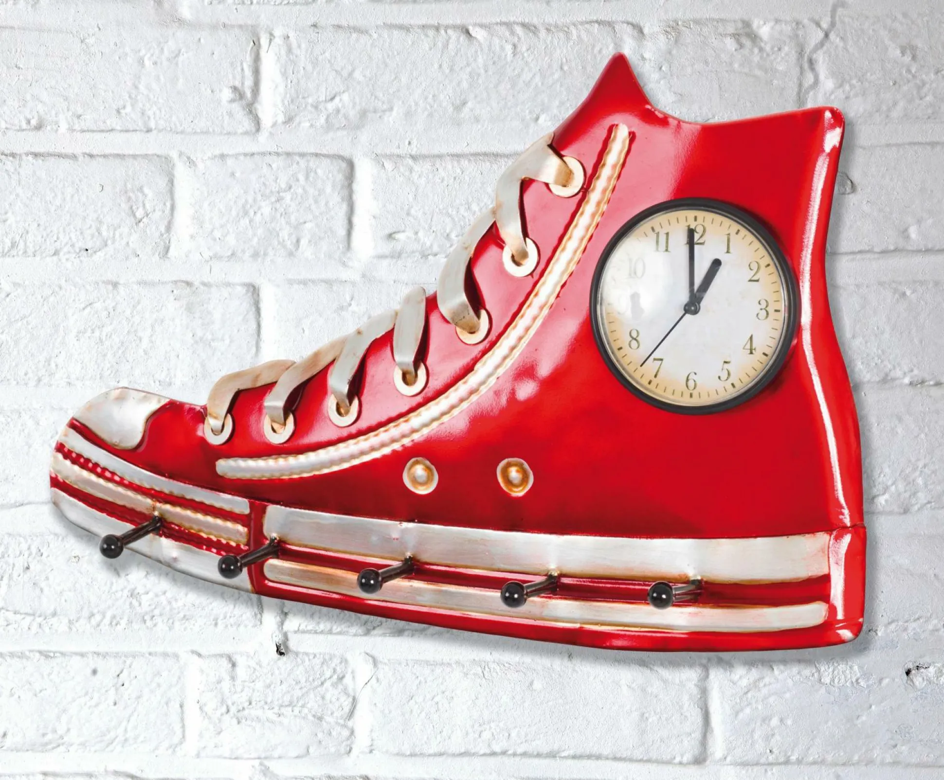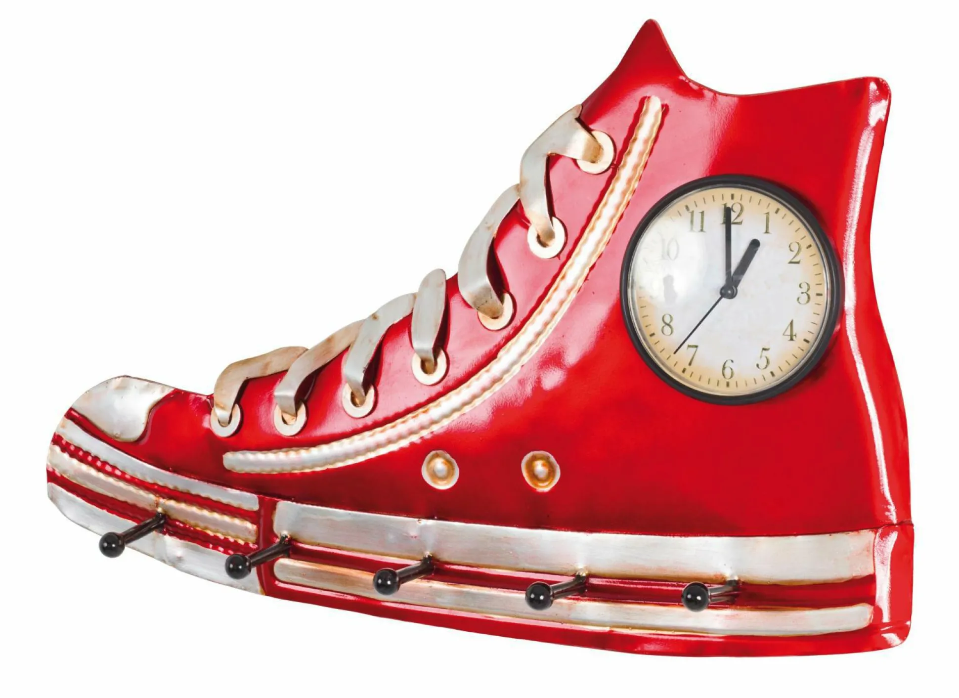 aus Metall in 3D Optik rot lackiert, mit 5 Garderobenhaken und integrierter Uhr, montiert