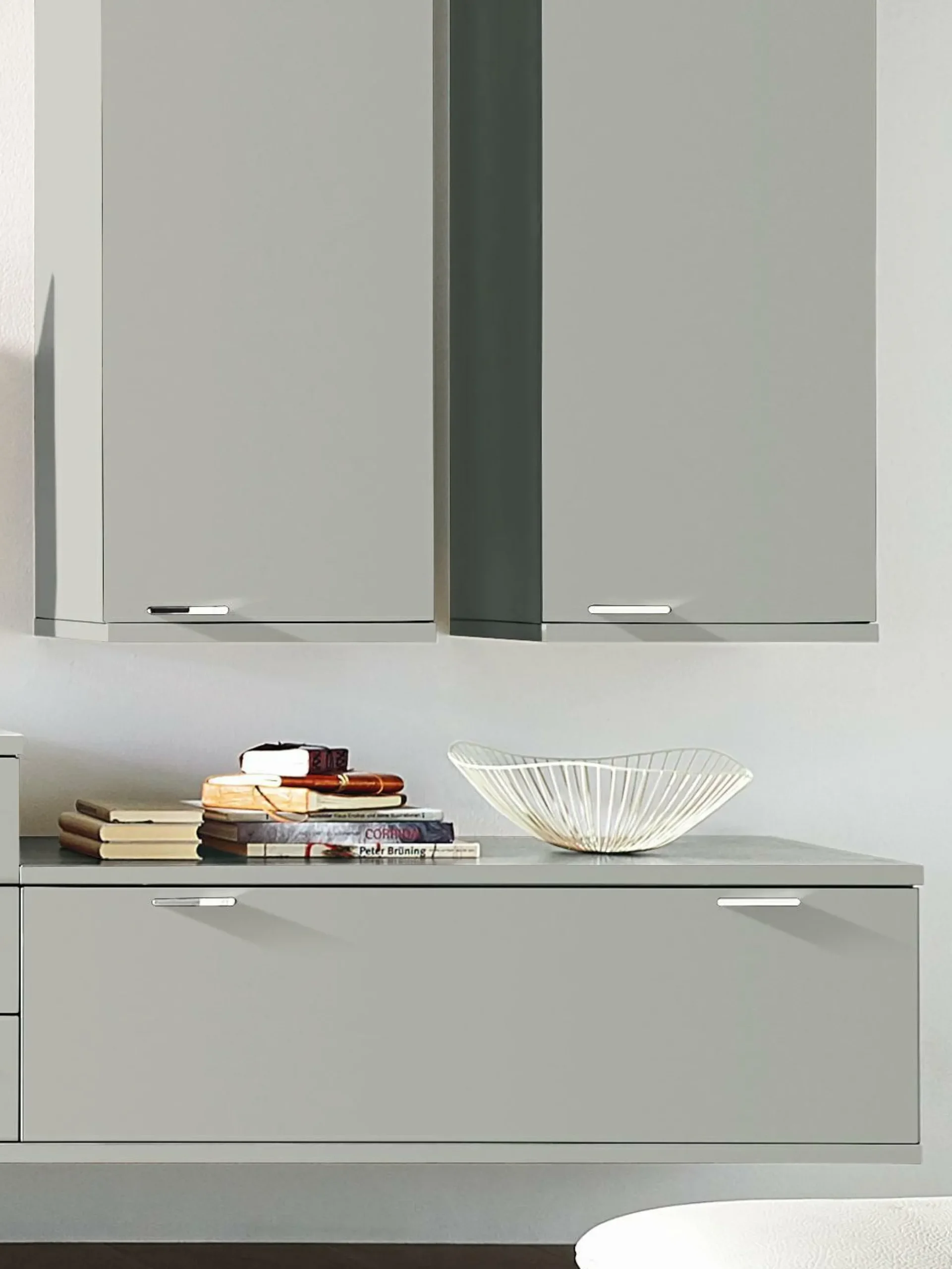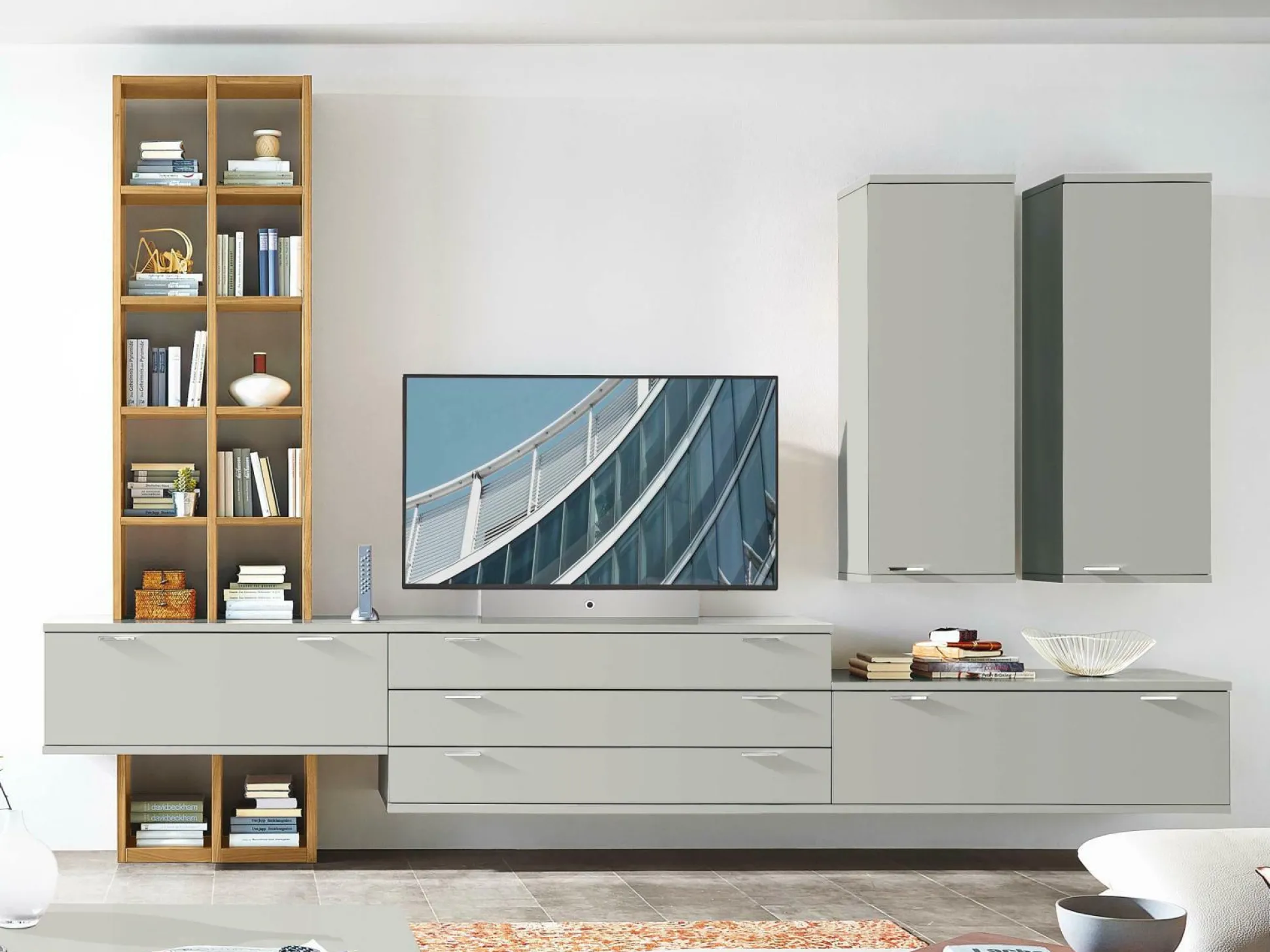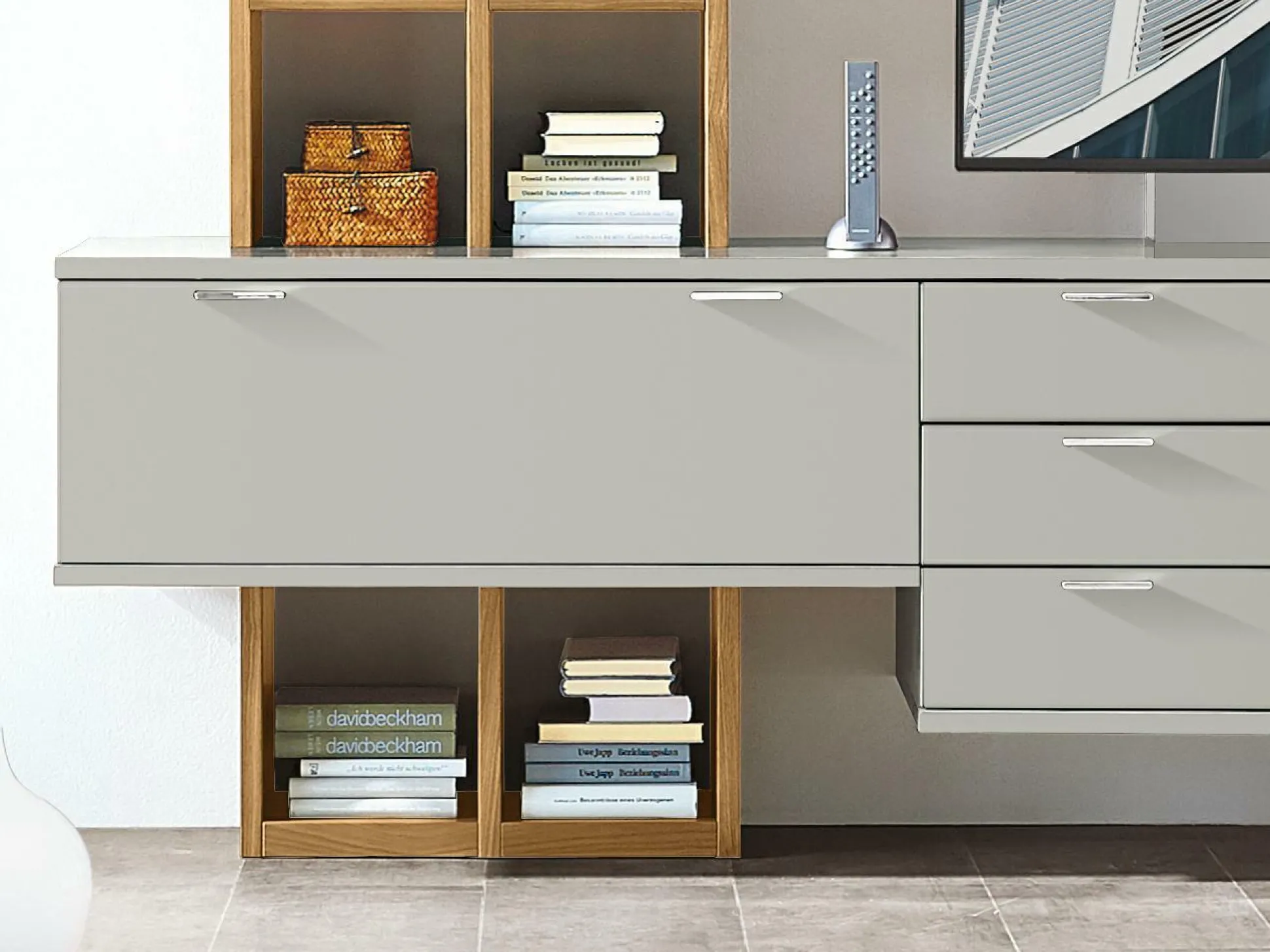 · ohne Beleuchtung, TV-Halterung und ohne weiteres Zubehör – Korpus und Front Lack grau. Regalelement Eiche sand furniert. In weiteren Farben lieferbar.